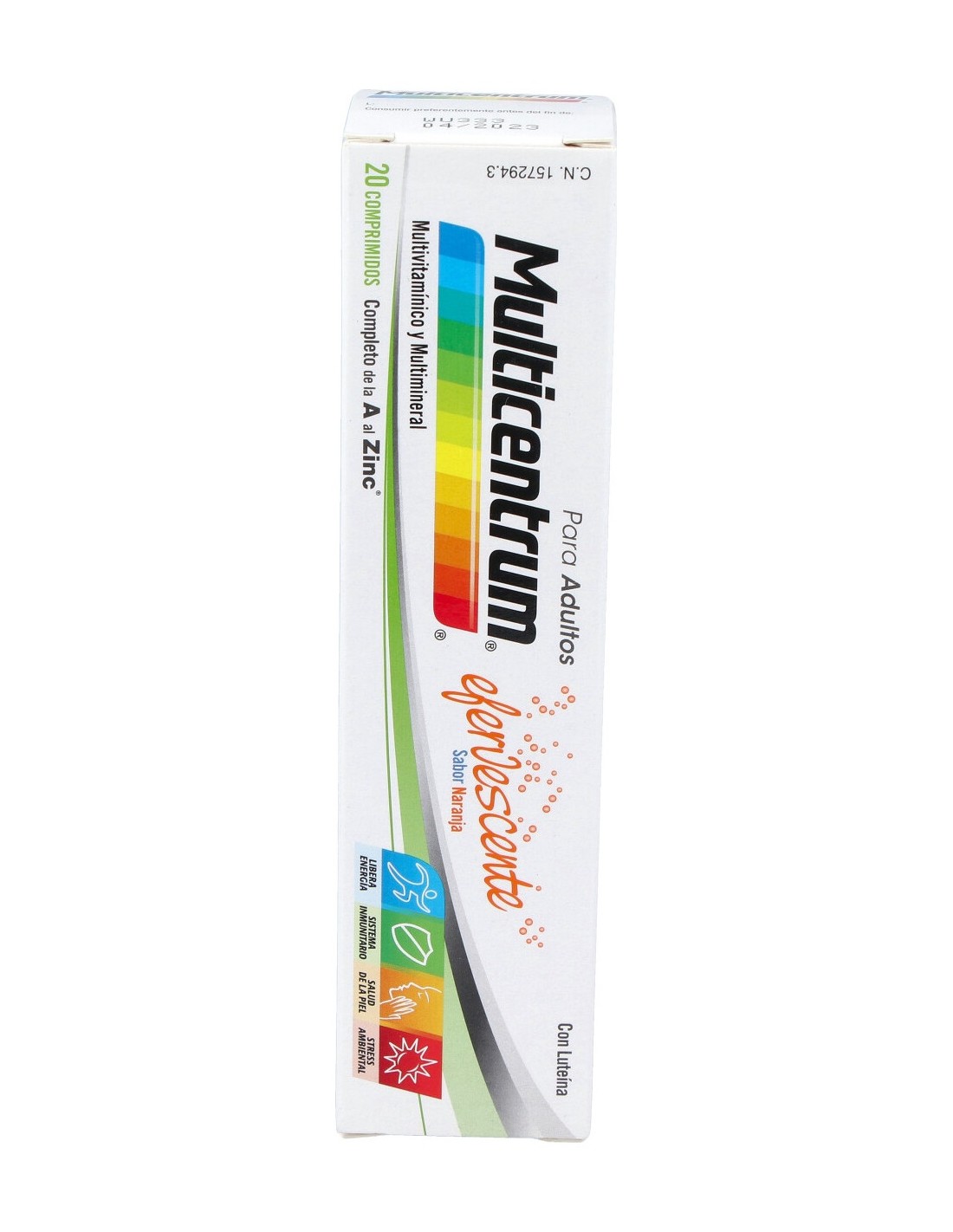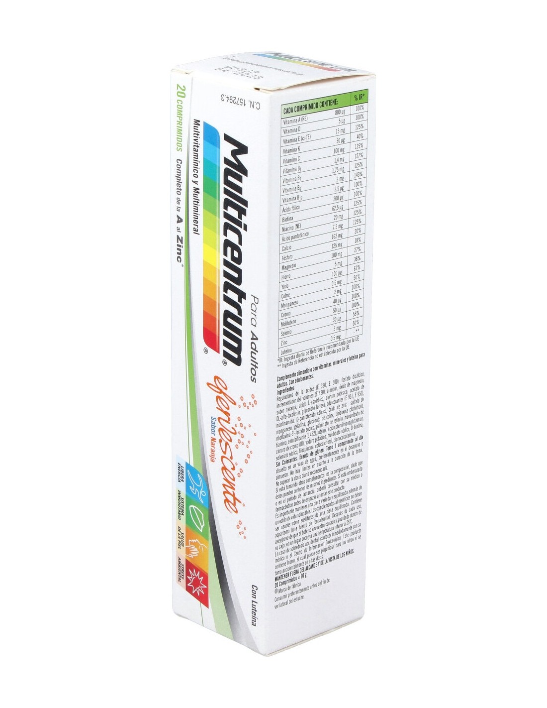 Reguladores de la acidez (E 330, E 500), fosfato dicálcico, incrementador del volumen (E 420), almidón, óxido de magnesio, sabor naranja, ácido L-ascórbico, cloruro potásico, acetato de DL-alfa-tocoferilo, gluconato ferroso, edulcorantes (E 951, E 950), nicotinamida, D-pantotenato cálcico, óxido de zinc, sulfato de manganeso, gelatina, gluconato de cobre, piridoxina clorhidrato, riboavina-5´-fosfato sódico, palmitato de retinilo, mononitrato de tiamina, emulsicante (E 432), luteína, ácido pteroilmonoglutámico, cloruro de cromo (III), yoduro potásico, molibdato sódico, D-biotina, seleniato sódico, filoquinona, colecalciferol, cianocobalamina.