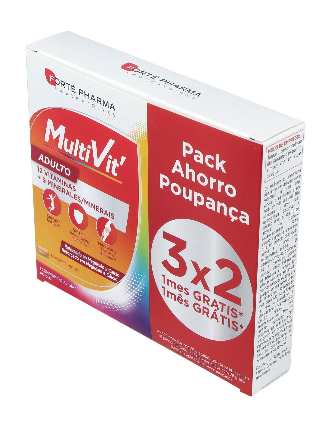 Por comprimido: Vitamina A (Retinol): 800 mcg Vitamina D3 (Colecalciferol): 5 mcg Vitamina E (Tocoferol): 12 mg Vitamina C (Ácido Ascórbico): 80 mg Vitamina B1 (Tiamina): 1,1 mg Vitamina B2 (Riboflavina): 1,4 mg Vitamina B3 (Niacina): 16 mg Vitamina B6 (Piridoxina): 1,4 mg Vitamina B9 (Ácido fólico): 200 mcg Vitamina B12 (Cianocobalamina): 2,5 mcg Biotina: 50 mcg Ácido pantoténico: 6 mg Calcio: 240 mg Magnesio: 150 mg Hierro: 4,2 mg Zinc: 5 mg Cobre: 0,5 mg Manganeso: 1 mg Selenio: 50 mcg Cromo: 25 mcg Molibdeno: 25 mcg