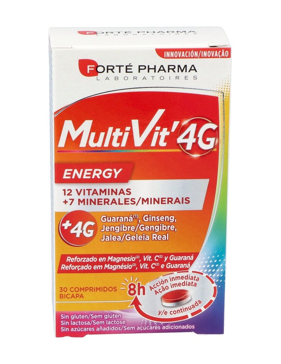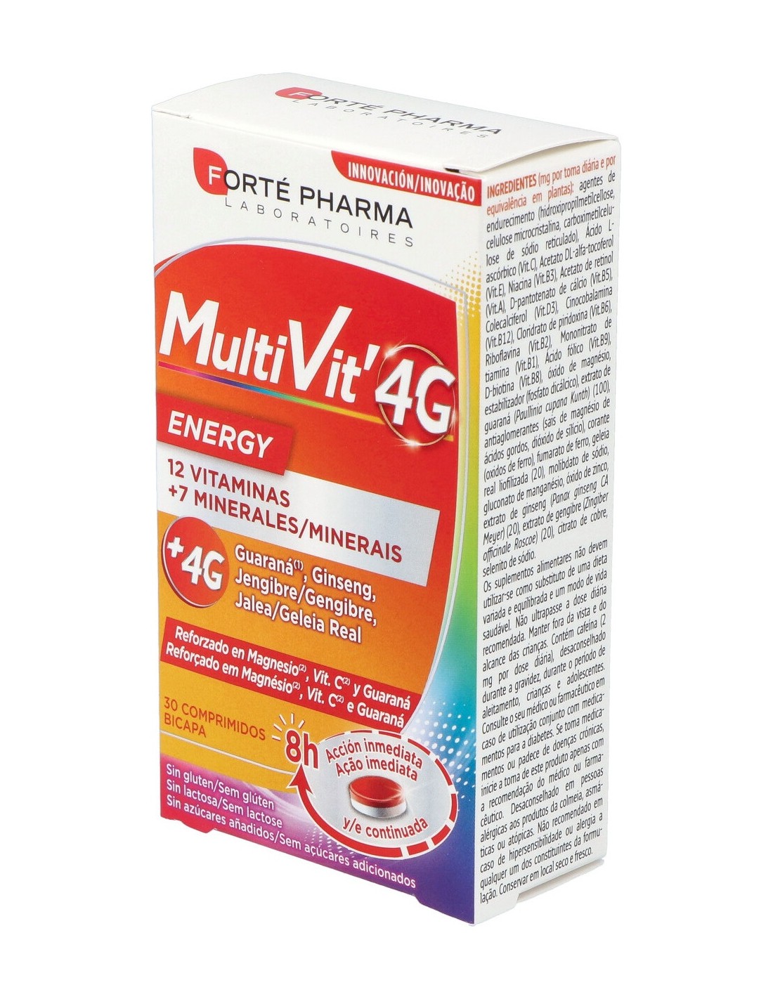Ingredientes: agentes de carga (celulosa microcristalina, hidroxipropilmetilcelulosa, carboximetilcelulosa sódica reticulada), vitaminas (C, E, B3, A, B5, B12, D3, B6, B2, B1, B9, B8), óxido de magnesio, fosfato dicálcico, antiaglomerantes (sales de magnesio de ácidos grasos, dióxido de silicio), extracto de guaraná (Paullinia cupana Kunth) (100), fumarato ferroso, colorante (óxido de hierro), jalea real liofilizada (20), molibdato de sodio, gluconato de manganeso, extracto de ginseng (Panax ginseng CA Meyer) (20), óxido de zinc, extracto de jengibre (Zingiber officinale Roscoe) (20), citrato de cobre, selenito de sodio.