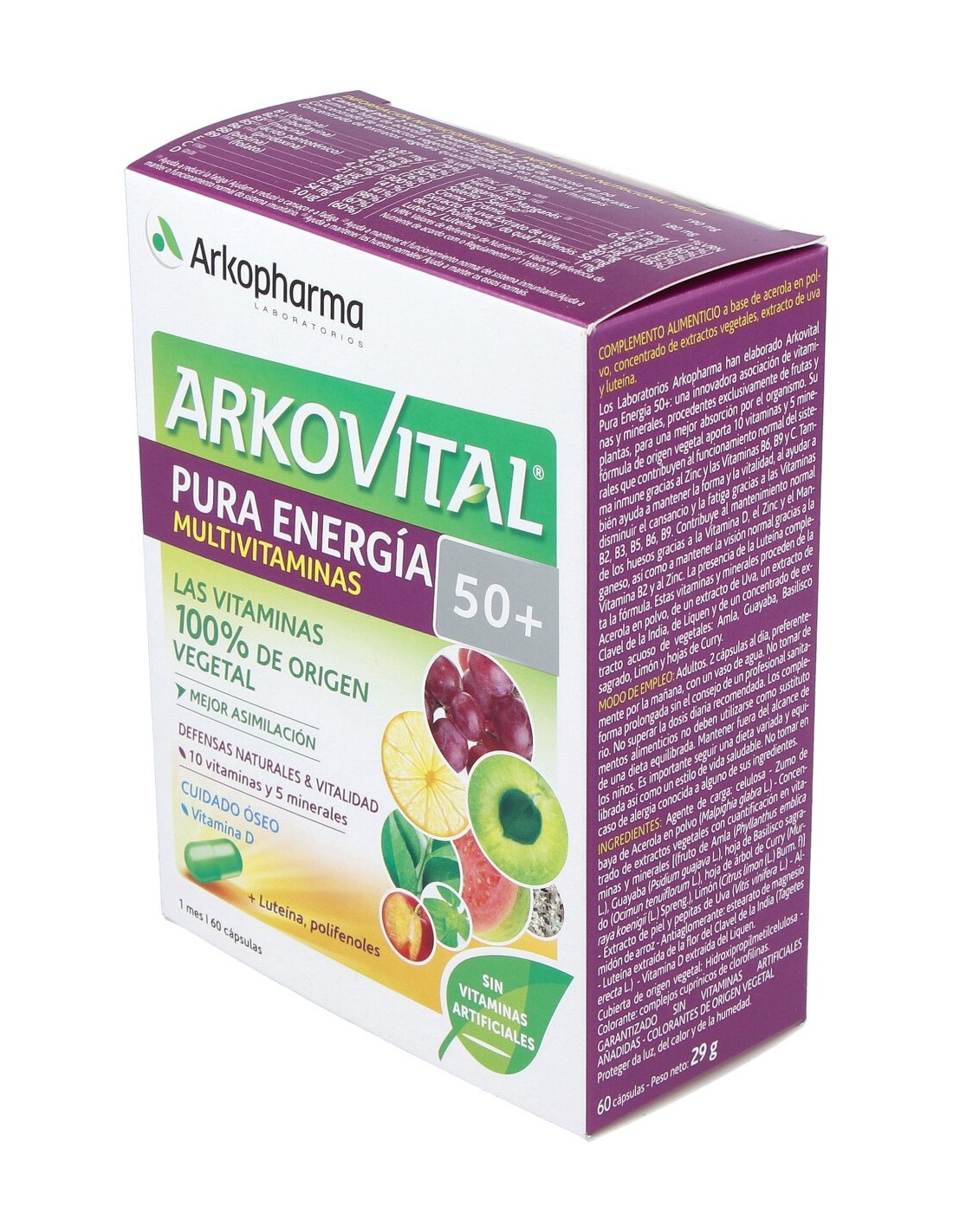 Por cápsula: Zumo de baya de acerola en polvo: 95 mg Concentrado de extractos vegetales cuantificado en vitaminas y minerales: 110 mg Extracto de uva: 40 mg/polifenoles: 28 mg