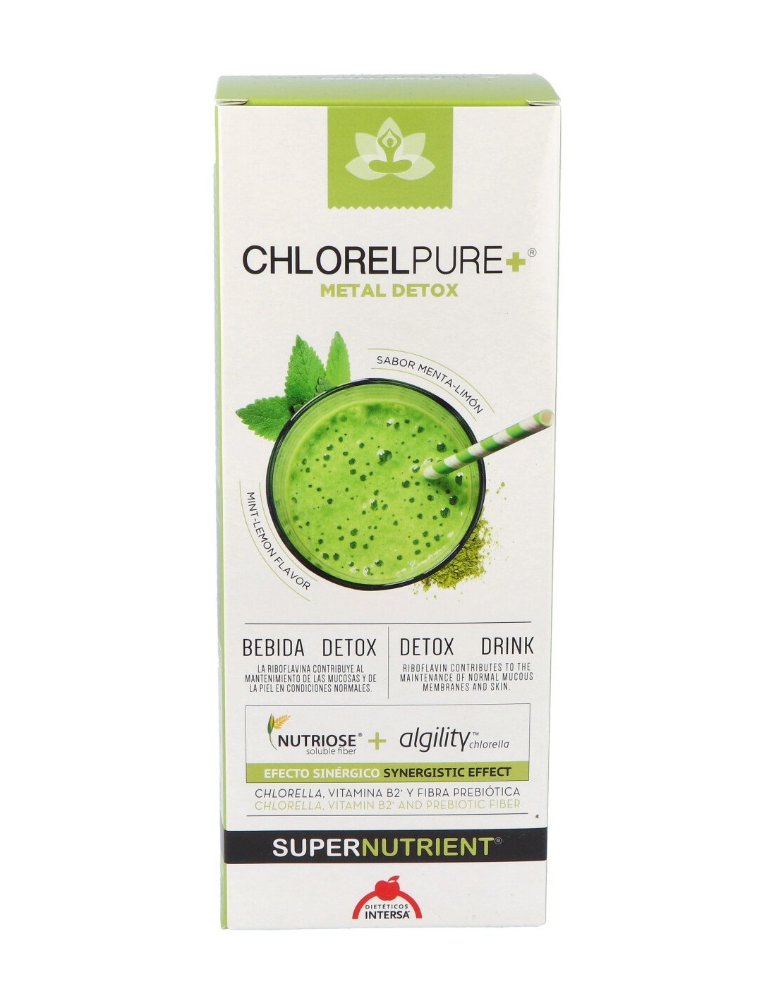 Agua: glicerina vegetal, Nutriose® (fibras solubles de maíz parcialmente hidrolizado): Algility™ polvo de chlorella (Chlorella vulgaris): ácido cítrico (acidificante): goma de acacia y goma xantana (espesantes): sorbato potásico (conservante): aroma de menta: aroma de limón: vitamina B2.