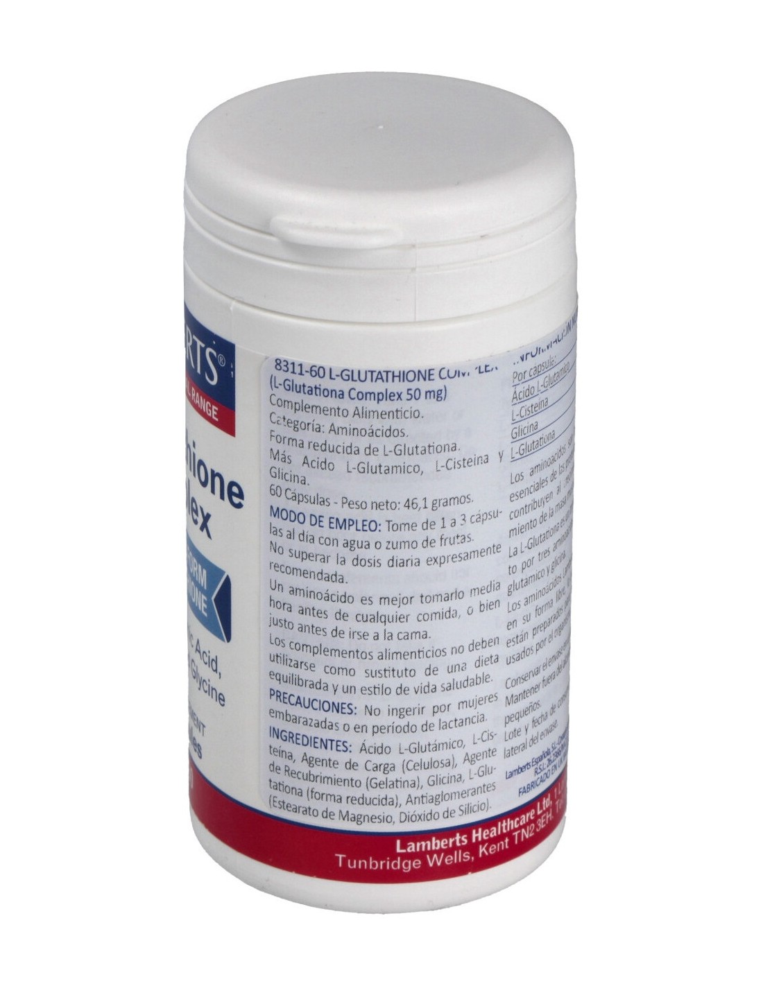 Complemento alimenticio que ayuda a proporcionar buenos niveles de varios aminoácidos, además de glutationa absoluta. Se utiliza tradicionalmente como desintoxicante natural e incluso como ayuda inmune. Puede reforzar la detoxificación, especialmente en personas con una carga tóxica elevada y está implicada en la formación de eritrocitos y de glóbulos blancos. L-Glutationa Complex contiene buenos niveles de cada péptido junto con glutationa ya formada para maximizar su absorción. La L-glutationa de Lamberts es un tripéptido compuesto por ácido glutámico, cisteína y glicina que forma parte de la enzima glutationa peroxidasa, uno de los antioxidantes más potentes del organismo. La glutatión se encuentra en todas las células en el cuerpo, con la más alta concentración en el hígado. Dado que puede formarse a partir de estos tres aminoácidos en el cuerpo, se considera no esencial porque no tiene que ser obtenido de los alimentos.