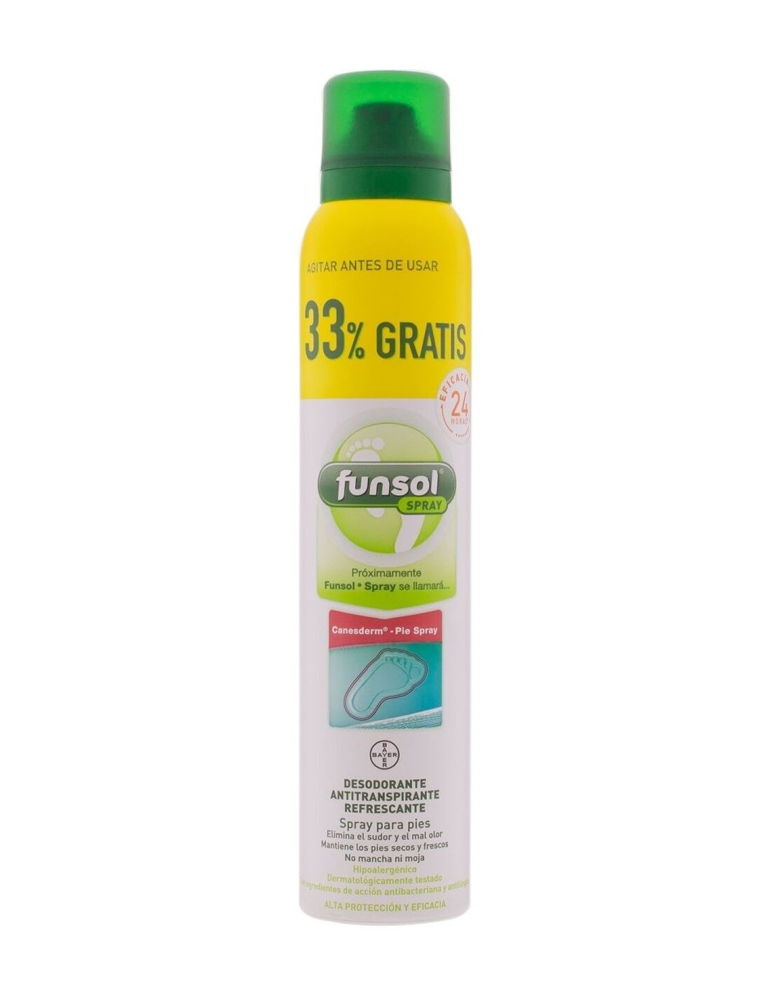Bayer Funsol® spray 150ml es un desodorante en spray antitranspirante específicamente diseñado para proteger los pies del mal olor y la transpiración. Por su fórmula aporta una sensación de frescor en tus pies y controla el exceso de sudor. Su fórmula tiene ingredientes de acción antibacteriana y antifúngica, que previenen el desarrollo de microorganismos y bacterias en los pies, evitando la producción de malos olores y hongos.