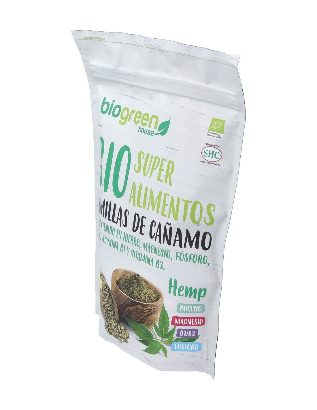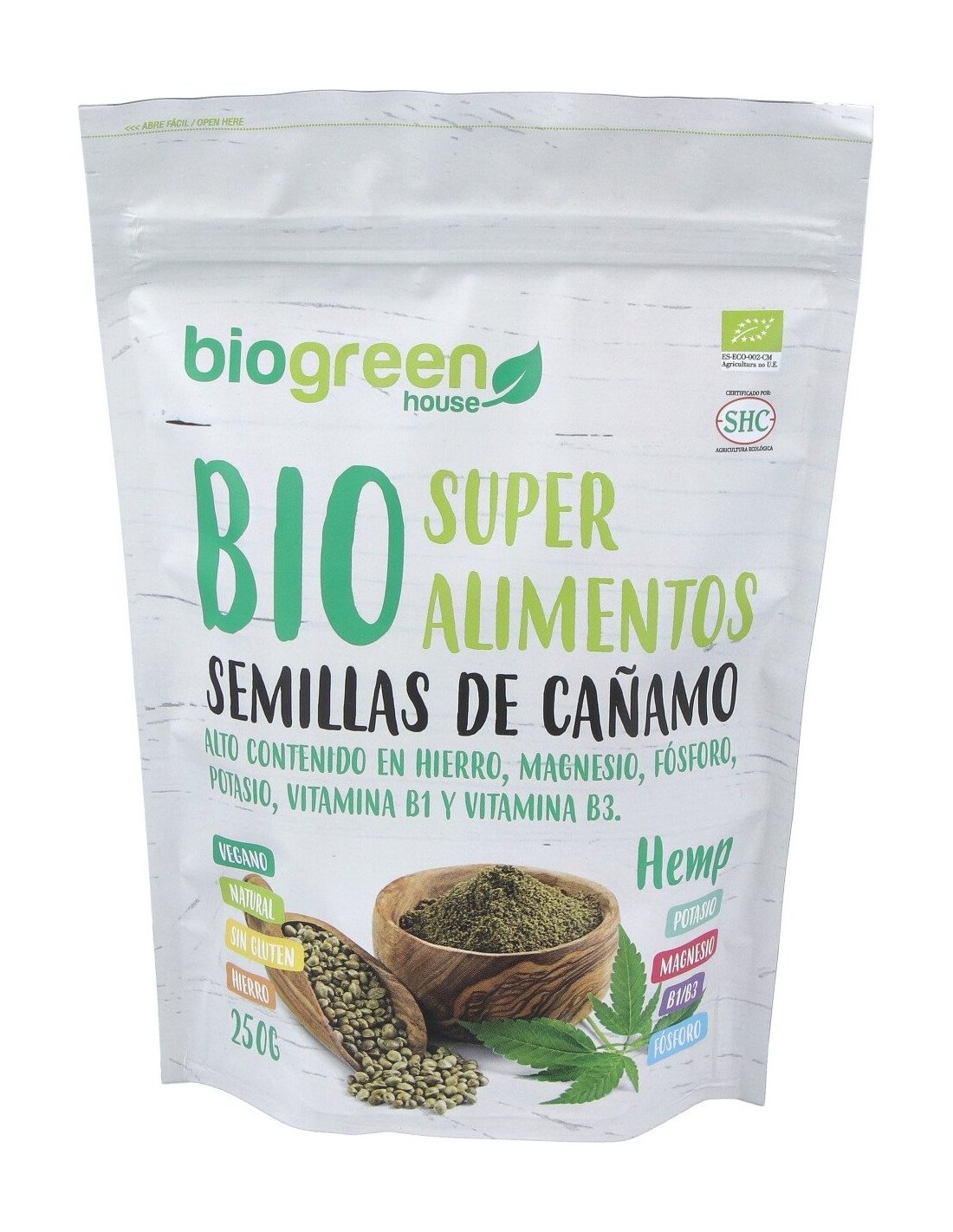 Fuente de proteína vegetal. Contiene muchos minerales como hierro, fósforo, magnesio y potasio. A su vez, ofrece un alto aporte de ácidos grasos esenciales, como son los Omega 3 y 6. Su riqueza en proteínas de origen vegetal las hace ideales para las dietas vegetarianas o deportivas. Apto para veganos. Alto contenido en Hierro, Magnesio, Fósforo, Potasio, Vitamina B1 y Vitamina B3.BIO SEMILLAS DE CAÑAMO 250gr. de BIOGREEN