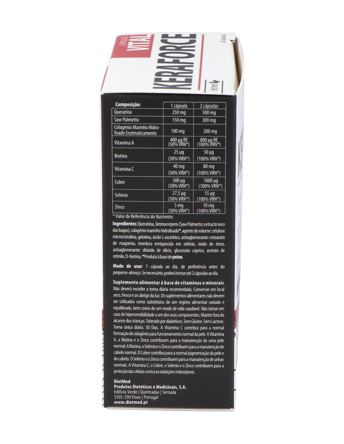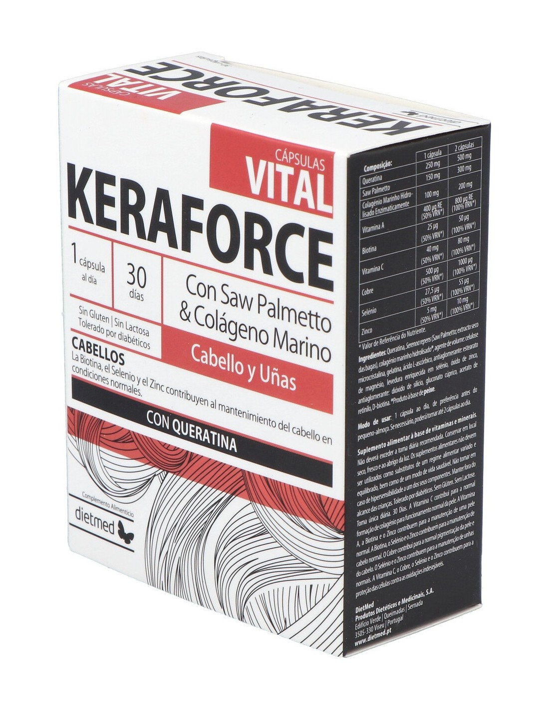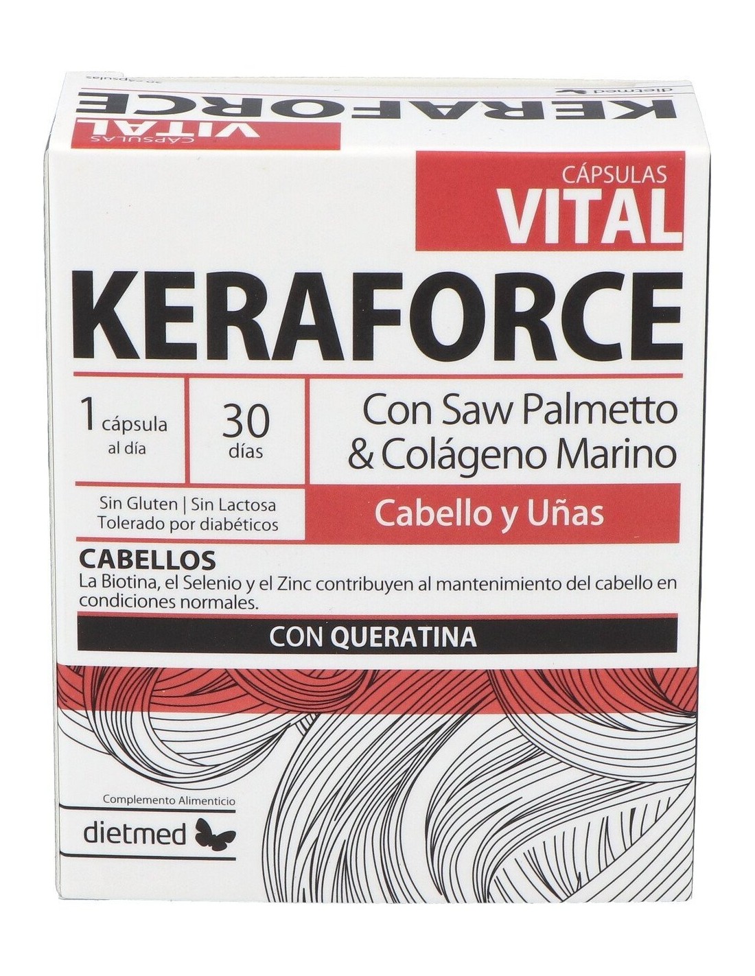 Aumenta la resistencia, el brillo y belleza del cabello y uñas, combate la caída natural del cabello y protege el cabello de agresiones externas.KERAFORCE VITAL 30cap. de DIETMED