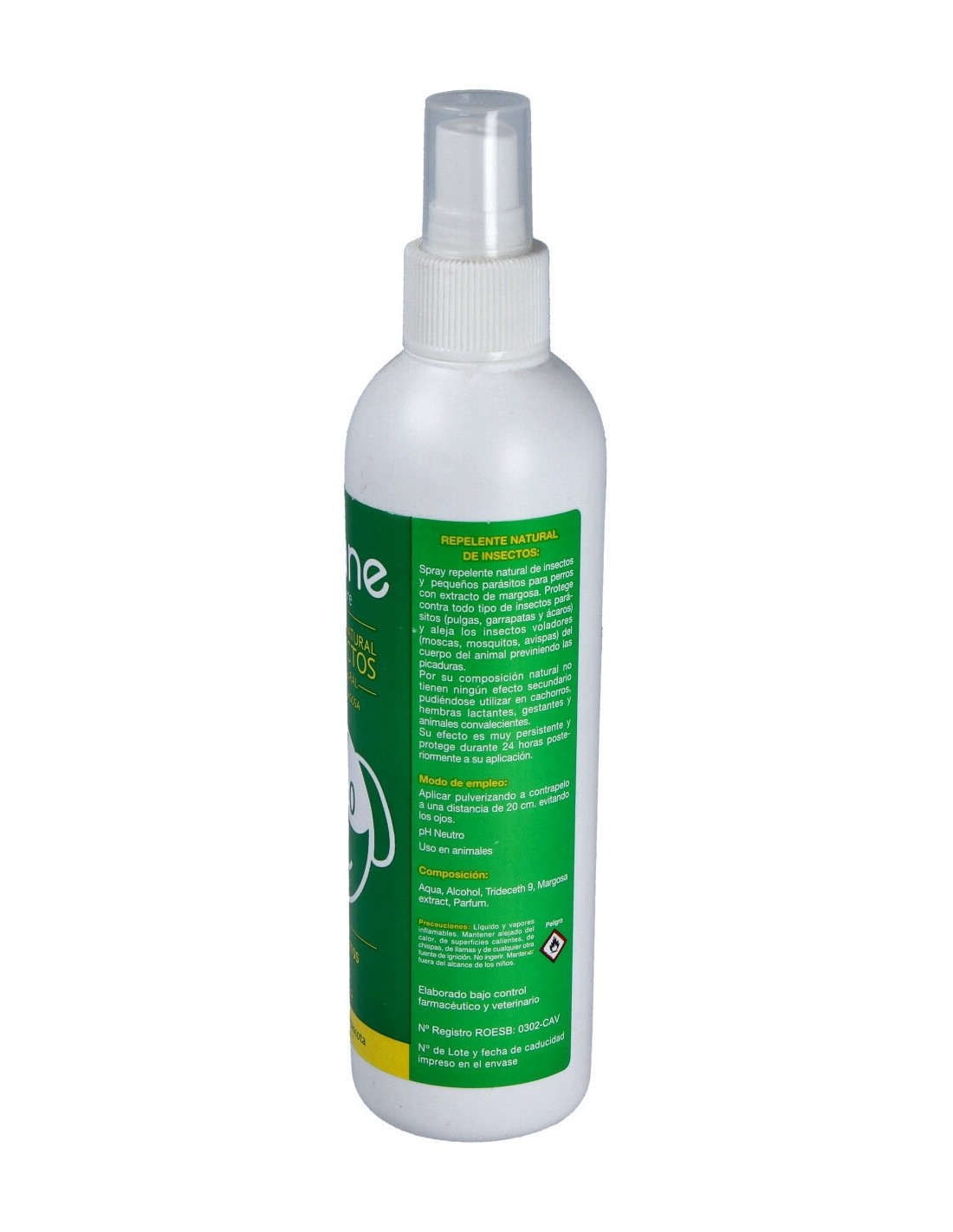 Spray repelente natural de insectos y pequeños parásitos para perros con extracto de Margosa (neem), insecticida de origen natural que actúa como tratamiento curativo y preventivo de insectos y parásitos. Protege contra todo tipo de insectos parásitos (pulgas, garrapatas y ácaros) y aleja los insectos voladores (moscas, mosquitos, avispas) del cuerpo del animal previniendo de las picaduras. Por su composición natural no tiene ningún efecto secundario pudiéndose utilizar en cachorros, hembras lactantes, gestantes y animales convalecientes. Su efecto es muy persistente y protege durante 24 horas posteriormente a su aplicación. PH neutro.