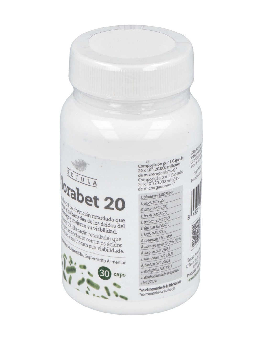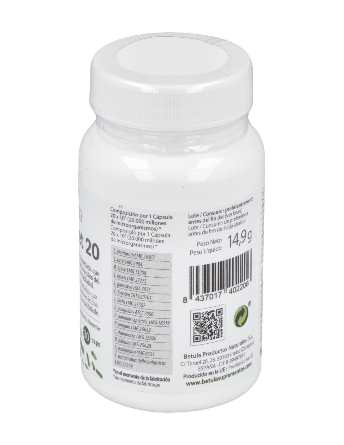 Agente de Carga (Maltodextrina de Maíz), Mezcla de Microorganismos Alimentarios Liofilizados (Lactobacillus plantarum LMG 26367, Lactobacillus casei LMG 6904, Bifidobacterium breve LMG 13208, Lactobacillus brevis LMG 27275, Lactobacillus paracasei LMG 7955, Enterococcus faecium THT 020101, Lactococcus lactis LMG 27352, Bacillus coagulans ATCC 7050, Bifidobacterium animalis ssp lactis LMG 18314, Bifidobacterium longum LMG 26652, Lactobacillus rhamnosus LMG 25626, Bifidobacterium bifidum LMG 25628, Lactobacillus acidophilus LMG 8151, Lactobacillus delbr bulgaricus LMG 27274), Agente de Recubrimiento (Hipromelosa).