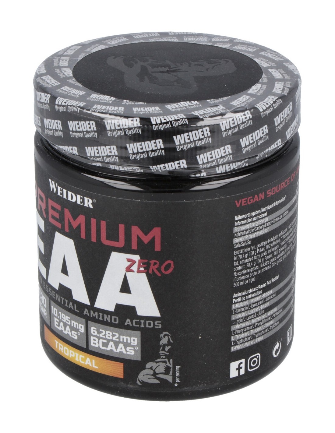 Aporta todos los aminoácidos esenciales, incluidos los aminoácidos ramificados (BCAA’s), en las condiciones óptimas que el organismo necesita para estimular la síntesis proteica y recuperar adecuadamente después de cada entrenamiento.WEIDER PREMIUM EAA zero tropical 325gr. de WEIDER