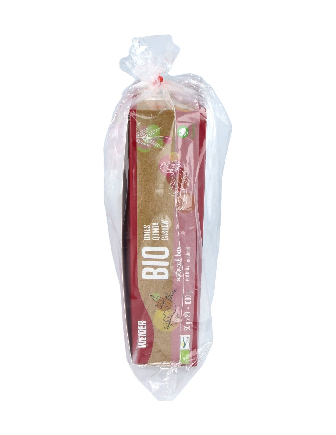 62% Pasta de dátil*, pasta de higo*, pasta de albaricoque*, 5,7% anacardo* (contiene sésamo), 5,7% copos de quinoa*, semillas de sésamo*, nueces*, canela en polvo*, jengibre en polvo*.