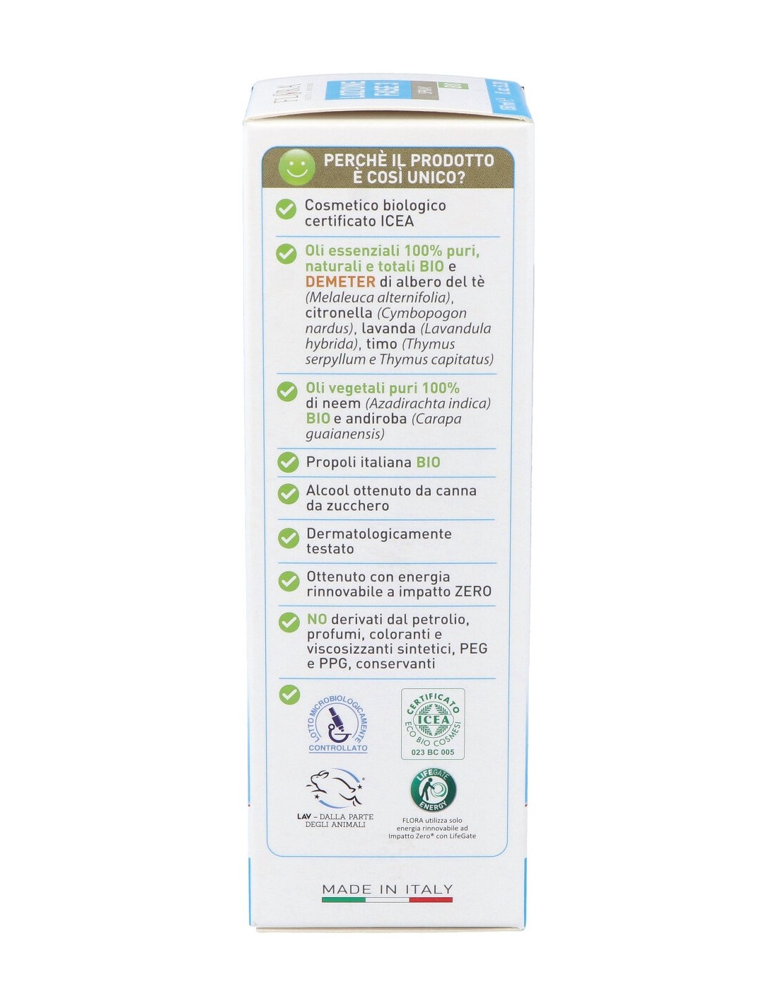 Aqua, Alcohol Denat., Caprylyl/Capryl Wheat Bran/Straw Glycosides, Fusel Wheat Bran/Straw Glycosides, Polyglyceryl-5 Oleate, Sodium Cocoyl Glutamate, Glyceryl Caprylate, Propolis extract*, Carapa guaianensis seed oil, Melia azadirachta seed oil*, Melaleuca alternifolia oil*, Lavandula hybrida oil**, Cymbopogon nardus oil*, Thymus vulgaris oil*, Origanum vulgare oil*, , Glycerin, Linalool, Geraniol, Limonene, Coumarin, Eugenol, Citronellol*, Farnesol.