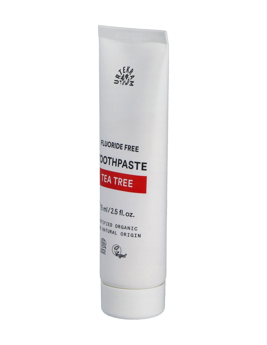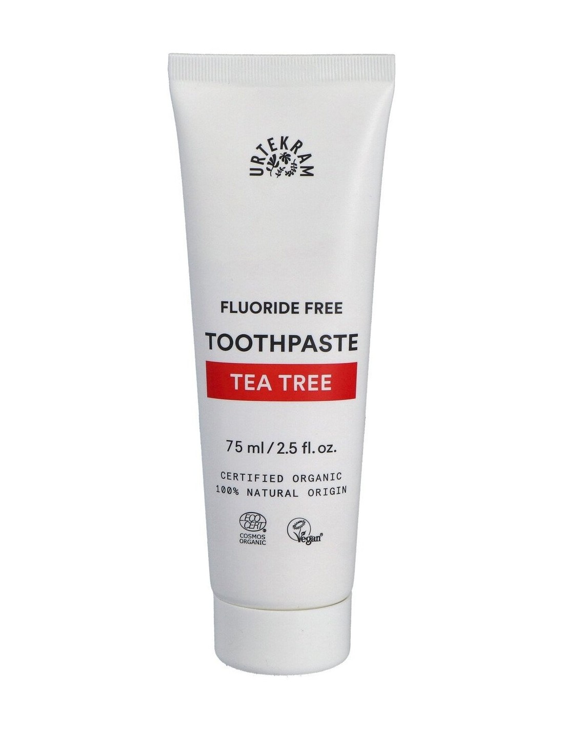 Dentífrico con árbol de té. Sin flúor. Eficaz en los diferentes aspectos del cepillado. La creta que contiene se recupera del fondo marino y se pulveriza. Es la razón del color natural de la pasta. El aceite de árbol de té ofrece un aporte extra para la acción desinfectante. El alto contenido de aloe vera ayuda a proteger las encías. El toque final es la mirra que tiene un efecto desinfectante. COSMOS ORGANIC certificado por Ecocert Greenlife. Vegano. No testado con animales.