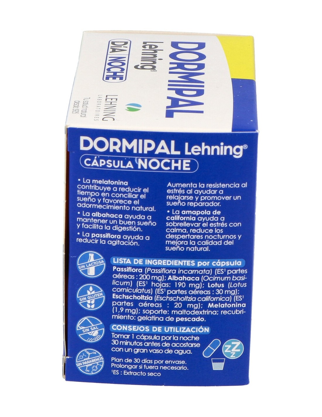 Contiene complemento de día (prepara el organismo para dormir) y complemento de noche (ayuda a la inducción rápida de un sueño de calidad)DORMIPAL 60cap. de LEHNING
