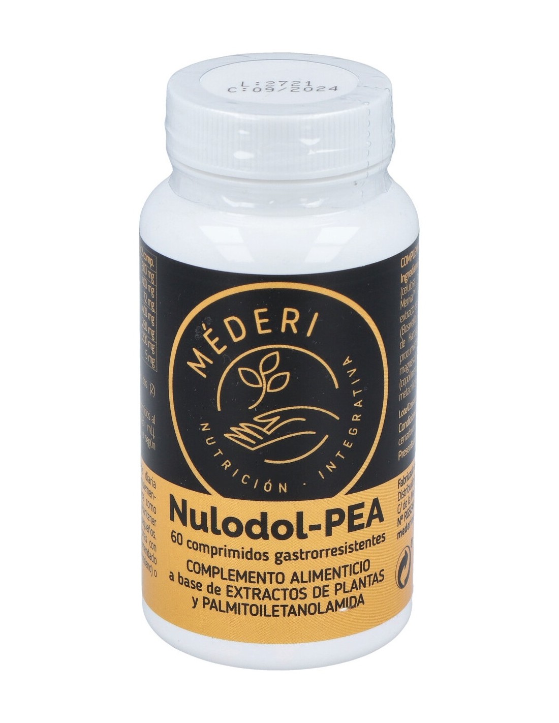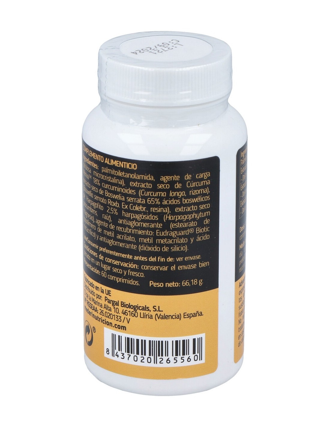 Palmitoiletanolamida, agente de carga (celulosa microcristalina), extracto seco de Cúrcuma Meriva™ 18% curcuminoides (Curcuma longa, rizoma), extracto seco de Boswelia serrata 65% ácidos boswélicos (Boswellia serrata Roxb. Ex Colebr., resina), extracto seco de Harpagofito 2,5% harpagósidos (Harpagophytum procumbens, raíz), antiaglomerante (estearato de magnesio), agente de recubrimiento: Eudraguard® Biotic (copolímero de metil acrilato, metil metacrilato y ácido metacrílico) y antiaglomerante (dióxido de silicio).