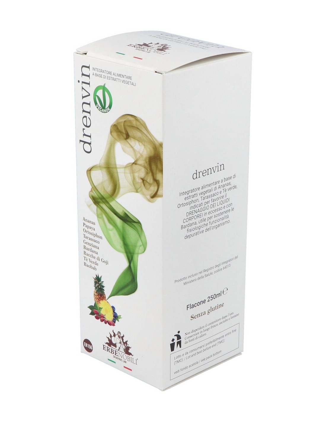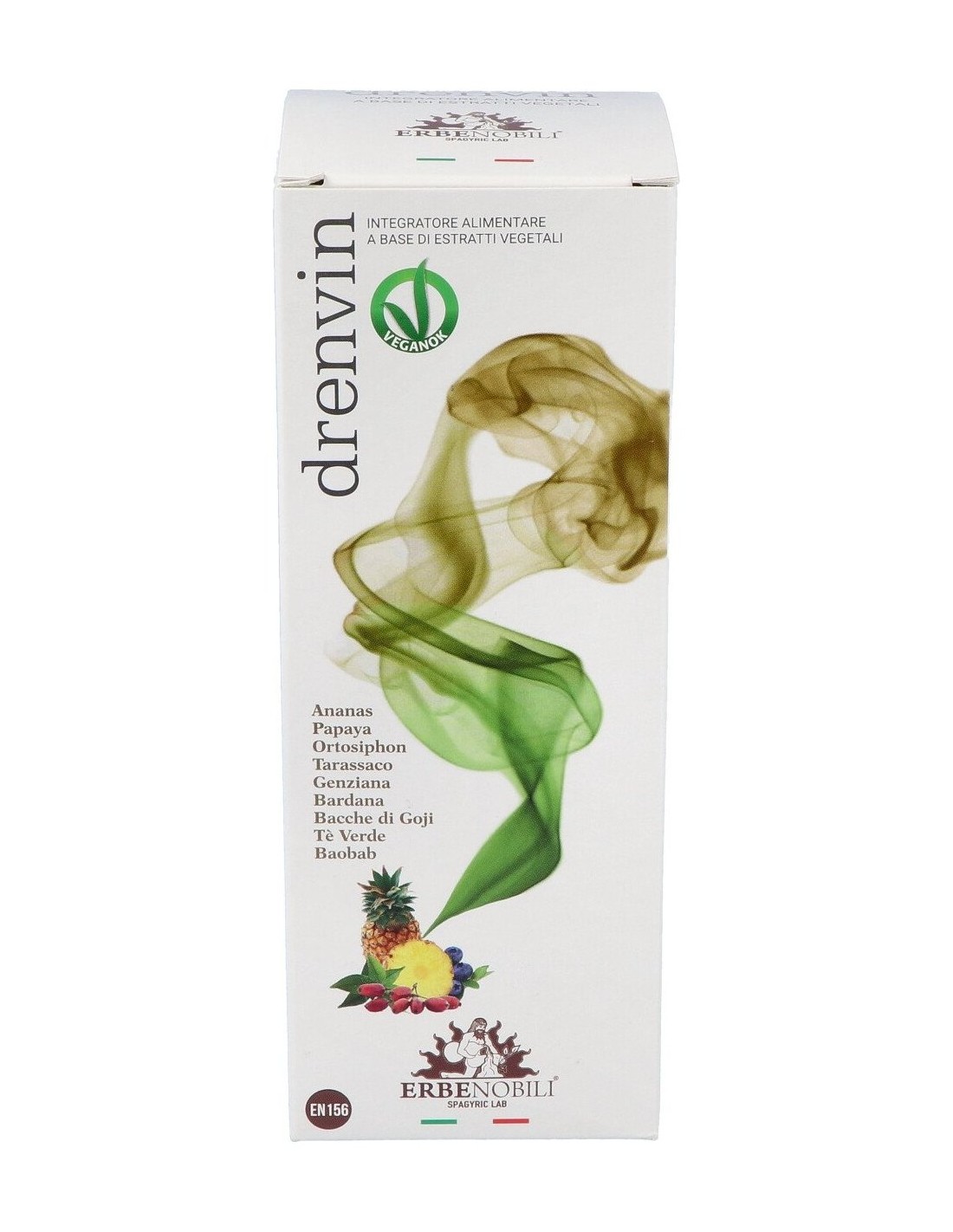 Agua: estabilizador: glicerina vegetal: Piña (Ananas comosus (L.) Merr) tallo extracto seco tit. al 0,3% en bromelina, Papaya (Carica papaya L.) fruto fermentado extracto seco, Ortosiphon (Ortosifón stamineus Benth.) hojas extracto seco tit. al 0,1 sinensetina, Diente de león (Taraxacum officinale Weber) raíz extracto seco, Genciana (Gentiana lutea L.) raíz extracto seco, aroma piña, Bardana (Arctium lappa L.) raíz extracto seco tit. 2% en inulina, Bayas de Goji (Lycium barbarum L.) frutos extracto seco, Té verde (Camellia sinensis L. Kuntze) hojas extracto seco, Baobab (Adansonia digitata L.) fruto extracto seco, conservante: sorbato de potasio.