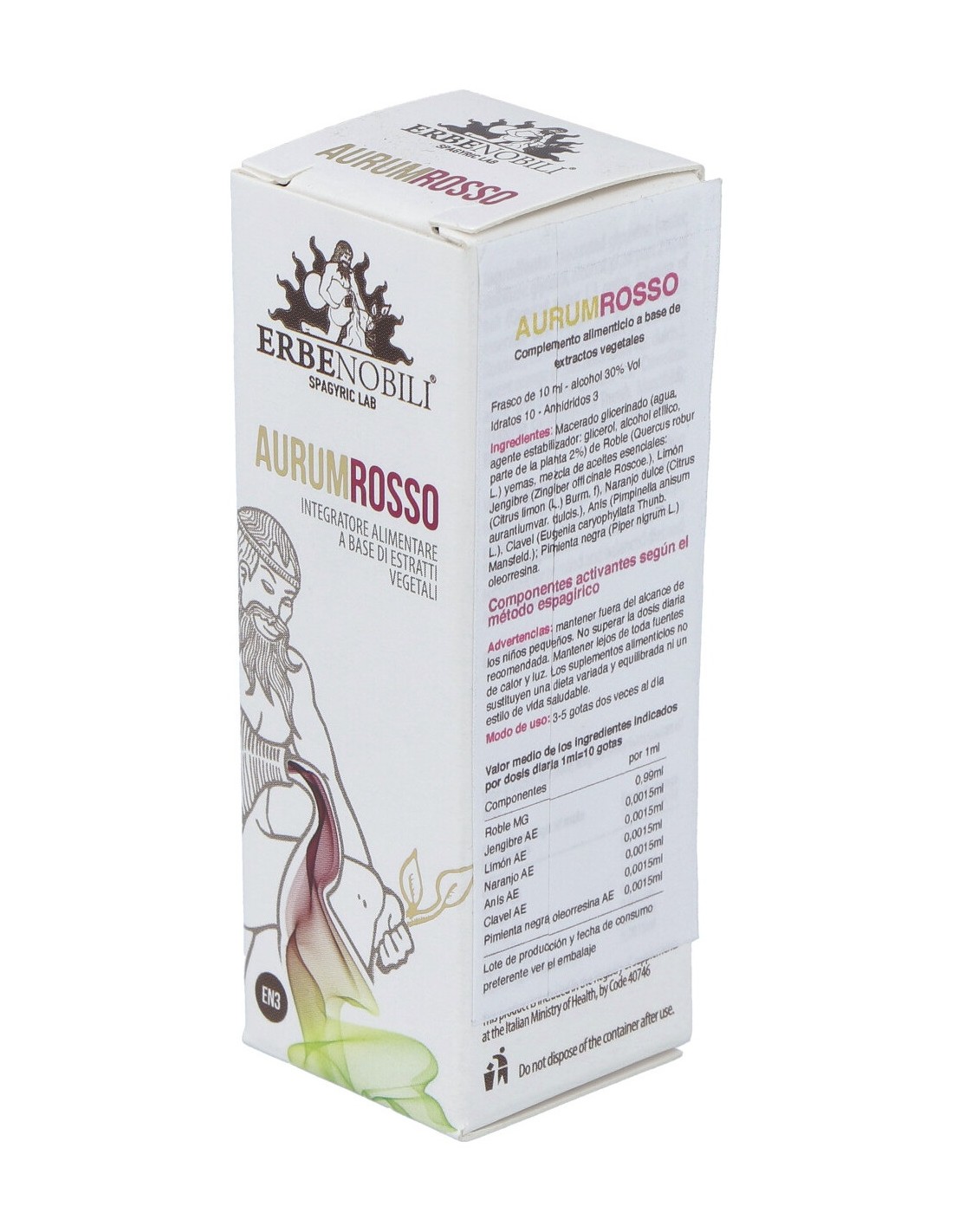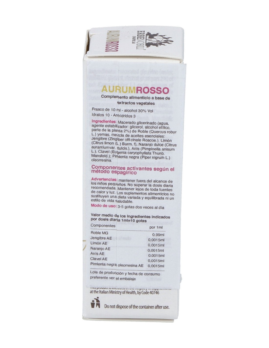 Macerado glicerinado (agua, agente estabilizador: glicerol, alcohol etílico, parte de la planta 2%) de Roble (Quercus robur L.) yemas, mezcla de aceites esenciales: Jengibre (Zingiber officinale Roscoe.), Limón (Citrus limon (L.) Burm. f), Naranjo dulce (Citrus aurantiumvar. dulcis.), Anís (Pimpinella anisum L.), Clavel (Eugenia caryophyllata Thunb. Mansfeld.): Pimienta negra (Piper nigrum L.) oleorresina.
