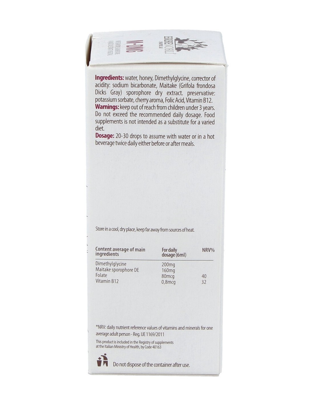 Agua, miel Dimetilglicina, corrector de acidez: bicarbonato de sodio, esporóforo de extracto seco de Maitake (Grifola frondosa Dicks Grey). Conservante: sorbato de potasio, sabor a cereza, ácido fólico, vitamina B12.