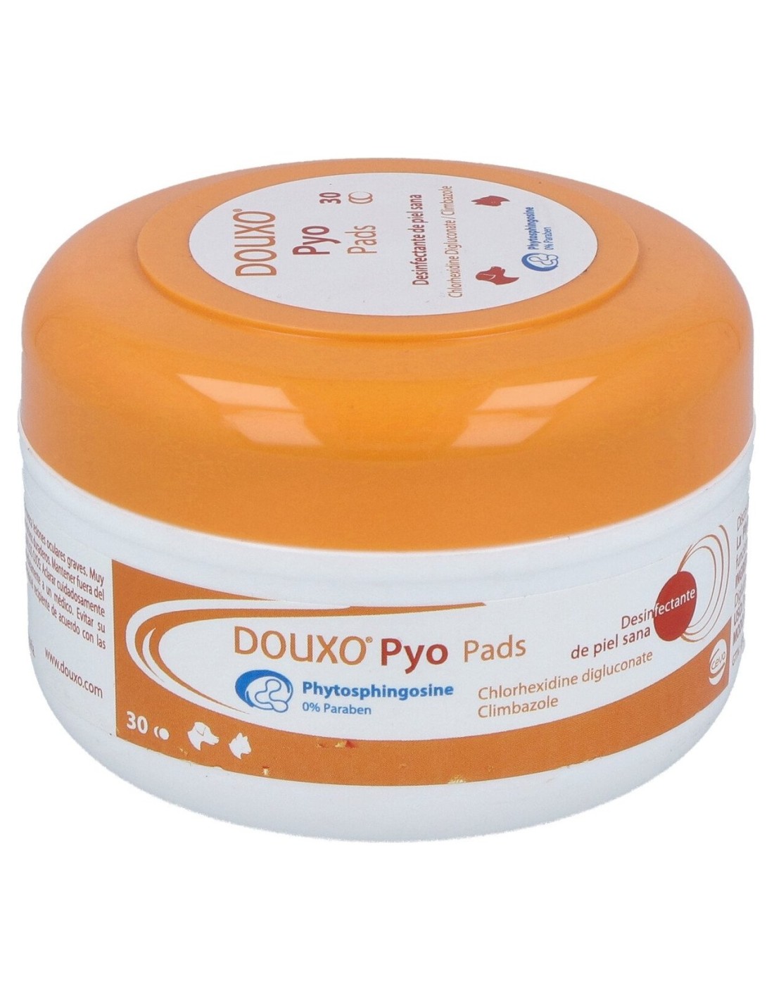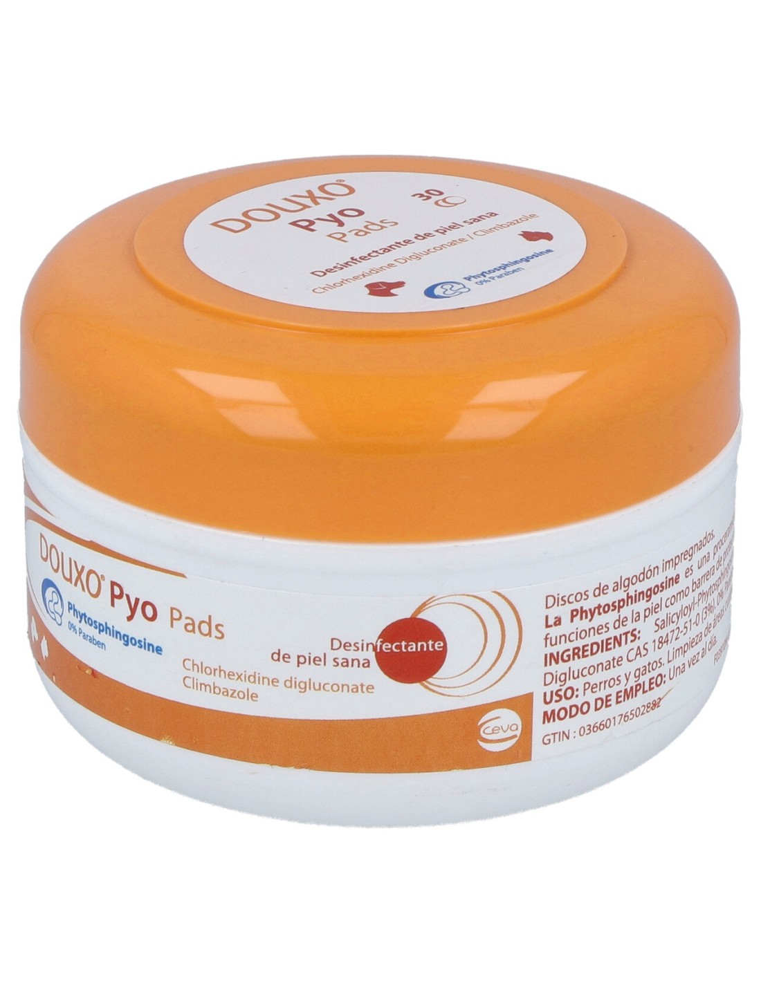 Discos de algodón antisépticos con Clorhexidina, Climbazol y Fitoesfingosina para limpieza de zonas localizadas en perros y gatos. Sin alcohol ni parabenos.