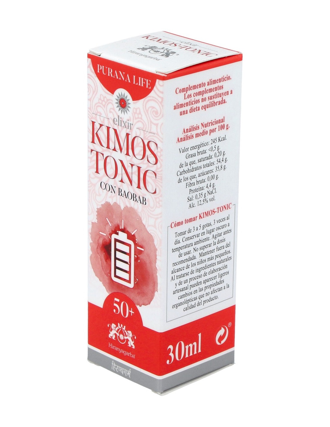 Agua: fructosa: gluconato ferroso: alcohol etílico: zumo de remolacha (Beta vulgaris): prolina: lisina: concentrado de baobab (Adansonia digitata): extracto de olíbano (Boswelia serrata): golden elixir [agua, alcohol etílico, fructosa, carbonato de potasio y esencias de naranja amarga (Citrus aurantium), limón (Citrus limonum), mandarina (Citrus nobilis), anís (Pimpinella anisum), cardamomo (Elettaria cardamomum), clavo (Syzygium aromaticum), jengibre (Zingiber officinale), pimienta negra (Piper nigrum) y cúrcuma (Curcuma longa)].