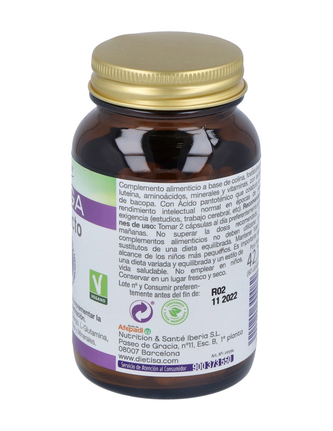 Citrato de colina, agente de carga: celulosa microcristalina, extracto seco de Bacopa 45% bacósidos (Bacopa monnieri (L.) Wettst., herba), fosfatidilserina, (soja)20%, extracto seco de Ginkgo 24% ginkgoflavonas (Ginkgo biloba L., hojas), L-glutamina, taurina, luteína 10%, antiaglomerantes: dióxido de silicio y sales magnésicas de ácidos grasos, bisglicinato de hierro, Dpantotenato cálcico, sulfato de zinc, cianocobalamina, clorhidrato de piridoxina, clorhidrato de tiamina y ác. pteroilmonoglutámico (ácido fólico). Cápsula: Hidroxipropilmetilcelulosa.
