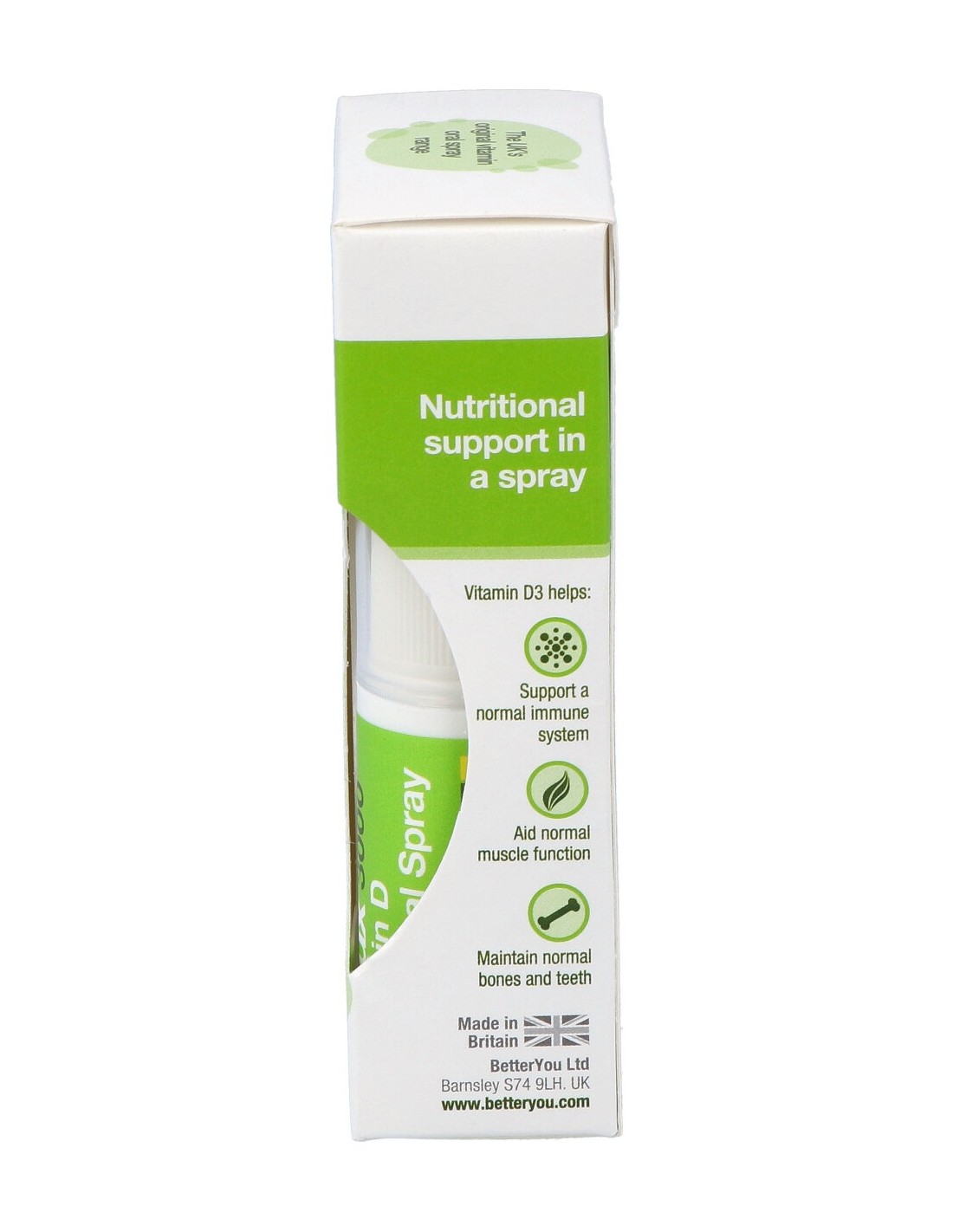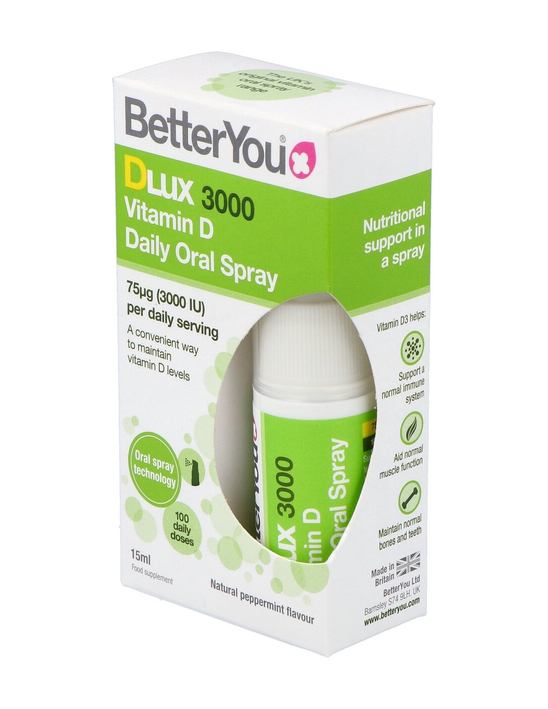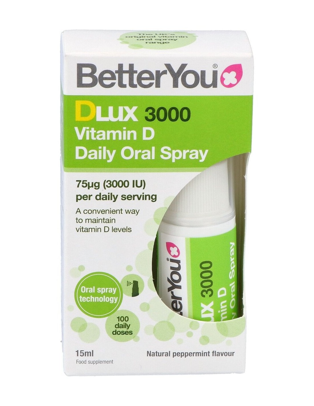 Aerosol oral de vitamina D de potencia óptima, especialmente formulado para administrar vitamina D a través del tejido blando de la boca para una absorción óptima. Apto para vegetarianos. Sabor a menta.