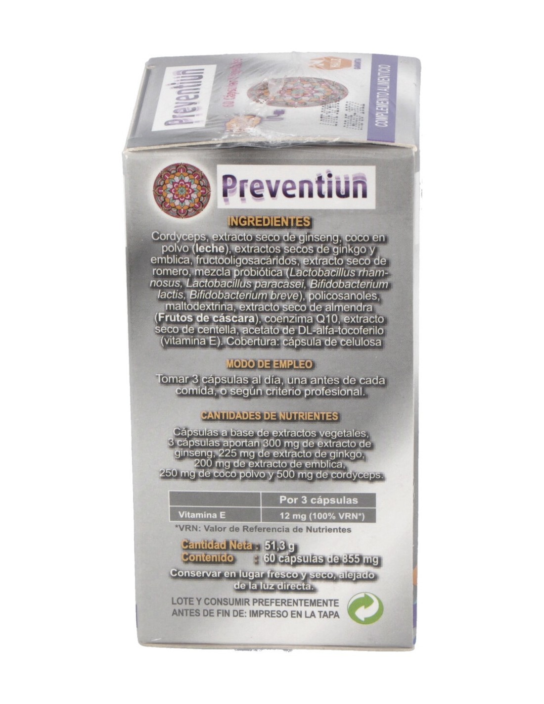 Cordyceps, extracto seco de ginseng, coco en polvo (leche), extractos secos de ginkgo y emblica, fructooligosacáridos, extracto seco de romero, mezcla probiótica (Lactobacillus rhamnosus, Lactobacillus paracasei, Bifidobacterium lactis, Bifidobacterium breve), policosanoles, maltodextrina, extracto seco de almendra, coenzima Q10, extracto seco de centella, acetato de DL-alfa tocoferilo (vitamina E). Cobertura: cápsula de celulosa.