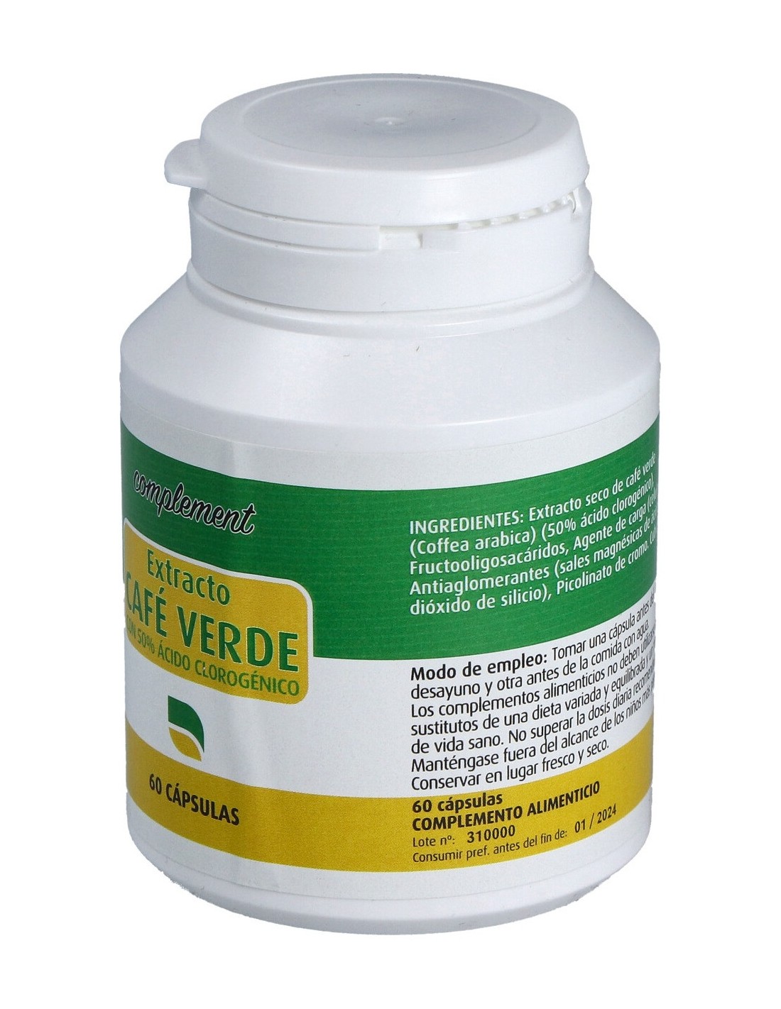 Extracto seco de café verde (50% ácido clorogénico), fructooligosacáridos, celulosa, sales magnésicas de ácidos grasos, dióxido de silicio, picolinato de cromo, gelatina.