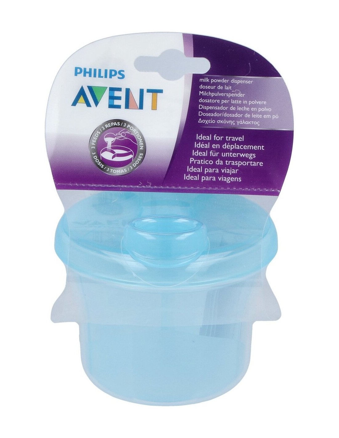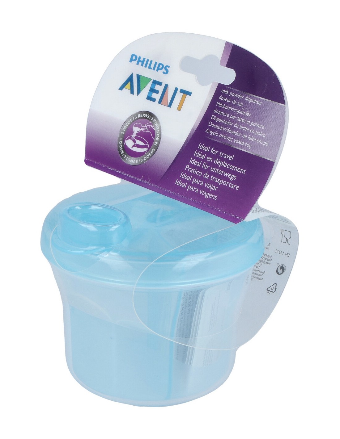 Este dosificador está dividido en 3 partes para contener las dosis de leche en polvo en compartimientos separados. El divisor interior puede quitarse para convertirlo en un práctico vasito para comida.