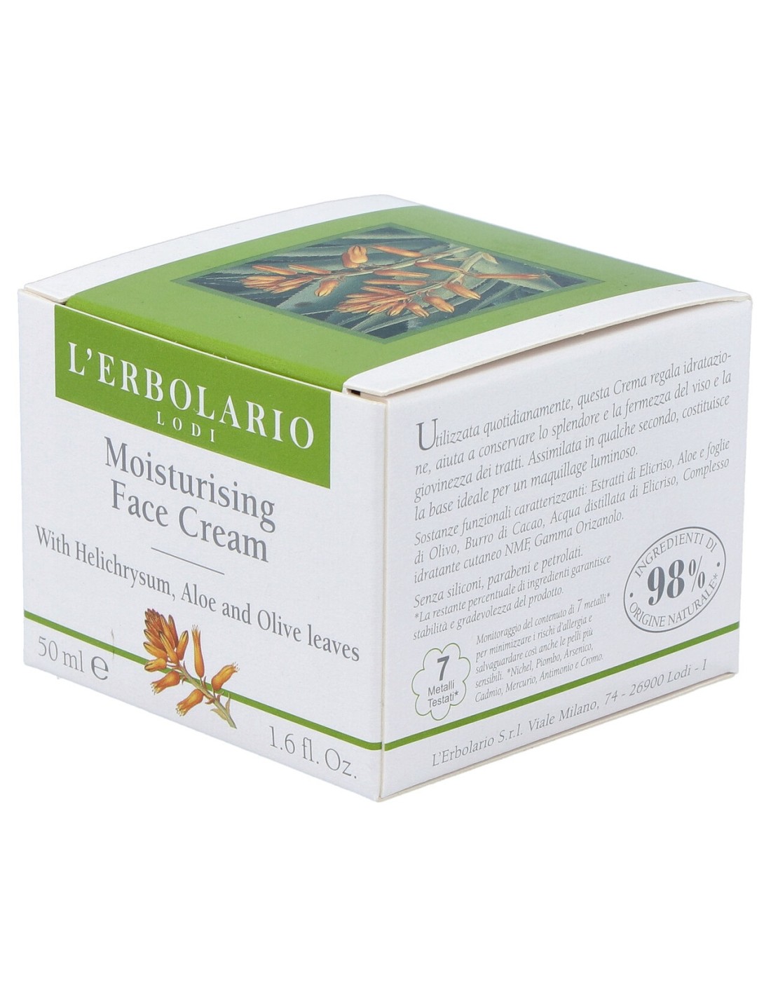 Extractos de Helichrysum, Aloe y hojas de olivo, Manteca de cacao, Agua destilada de Helichrysum, Complejo humectante de piel NMF, Gamma oryzanol.