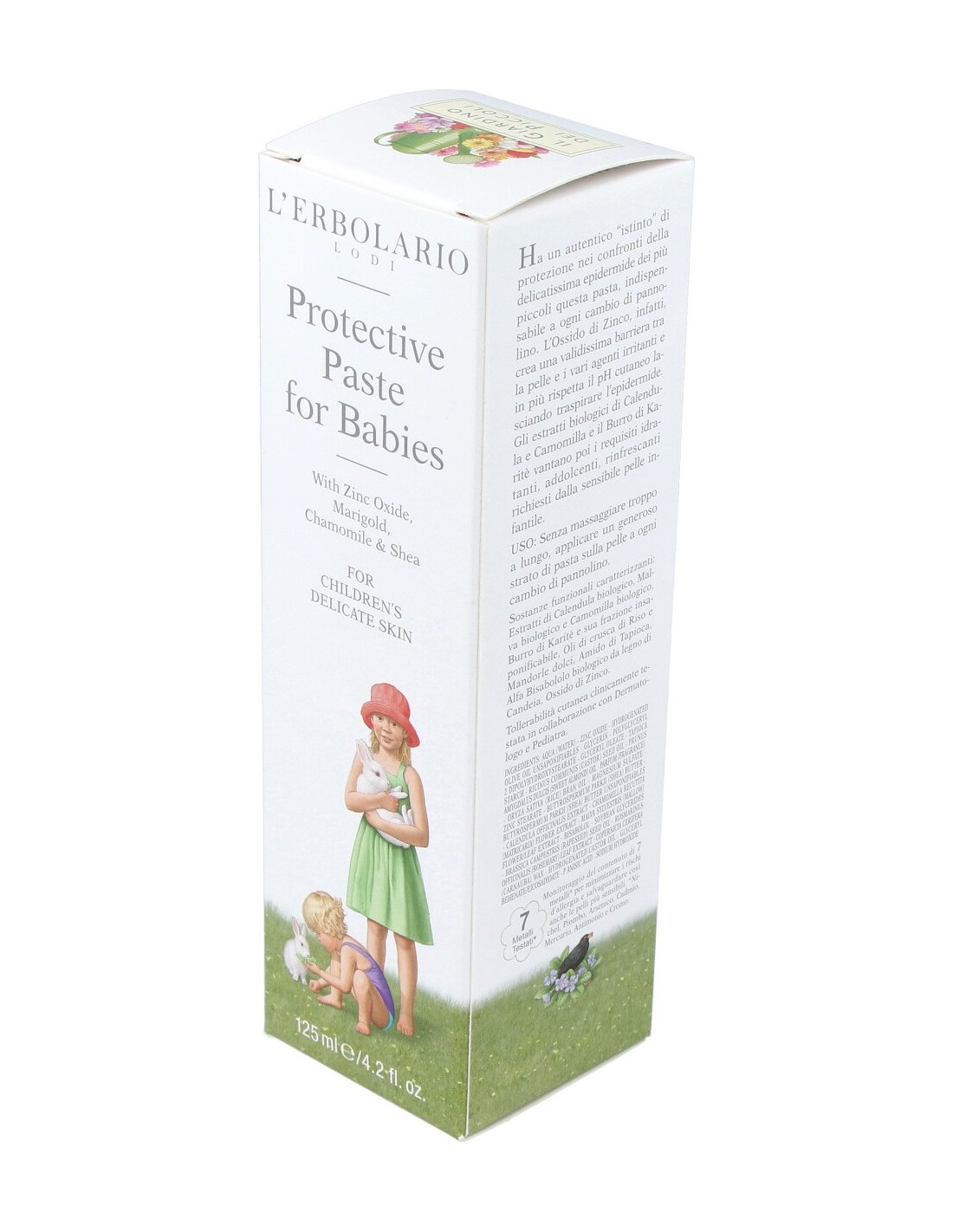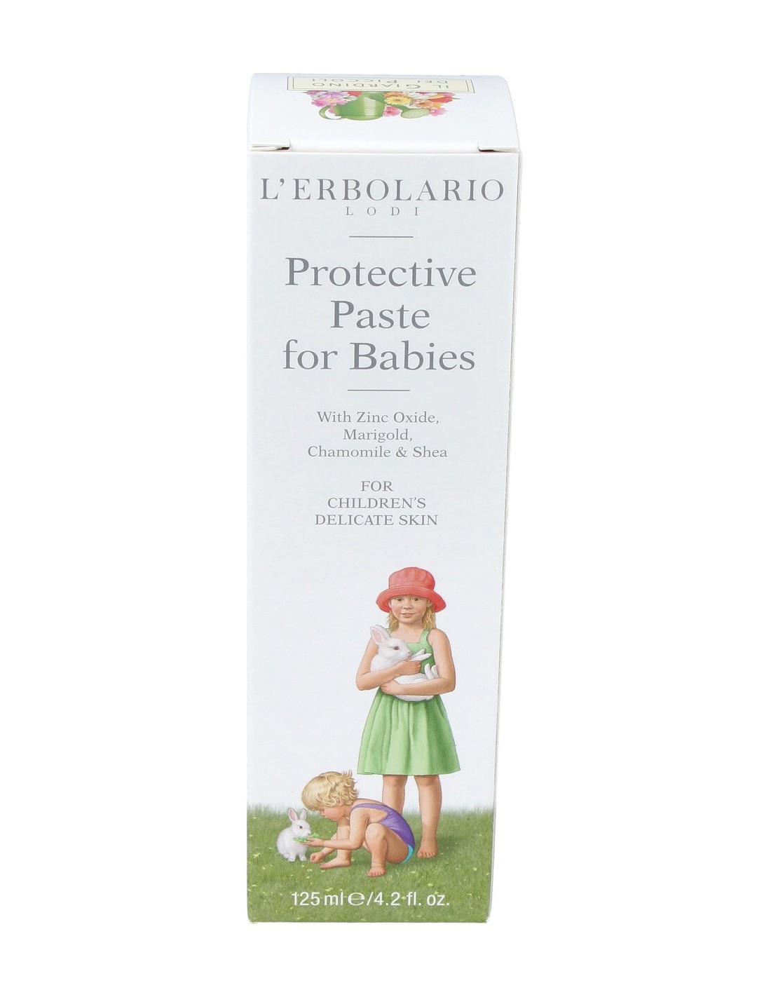 INCI: Aqua (Water), Zinc oxide, Hydrogenated olive oil unsaponifiables, Glycerin, Polyglyceryl-2 dipolyhydroxystearate, Glyceryl oleate, Tapioca starch, Ricinus communis (Castor) seed oil, Prunus amygdalus dulcis (Sweet almond) oil, Parfum (Fragrance), Magnesium sulfate, Oryza sativa (Rice) bran oil, Zinc stearate, Butyrospermum parkii (Shea) butter, Butyrospermum parkii (Shea) butter unsaponifiables, Calendula officinalis flower extract, Chamomilla recutita (Matricaria) flower extract, Malva sylvestris (Mallow) flower/leaf extract, Bisabolol, Citric acid, Soybean glycerides, Brassica campestris (Rapeseed) seed oil, Rosmarinus officinalis (Rosemary) leaf extract, Copernica cerifera (Carnauba) wax, Hydrogenated castor oil, Glyceryl behenate/eicosadioate, P-anisic acid, Sodium hydroxide, Potassium sorbate, Sodium benzoate.