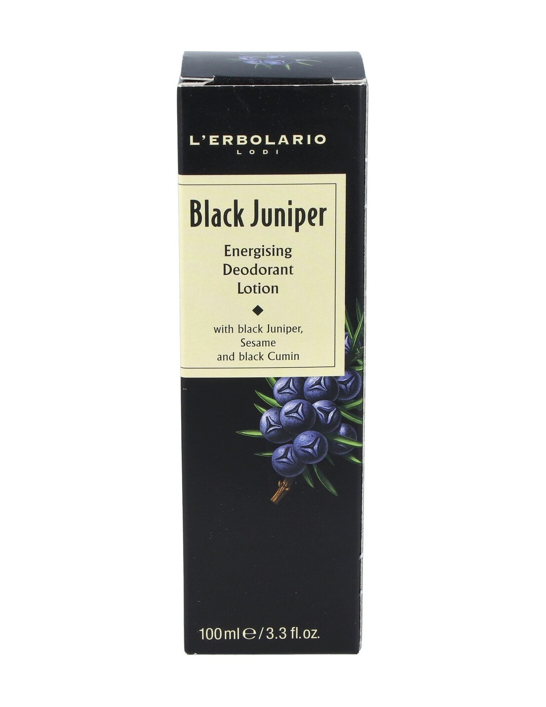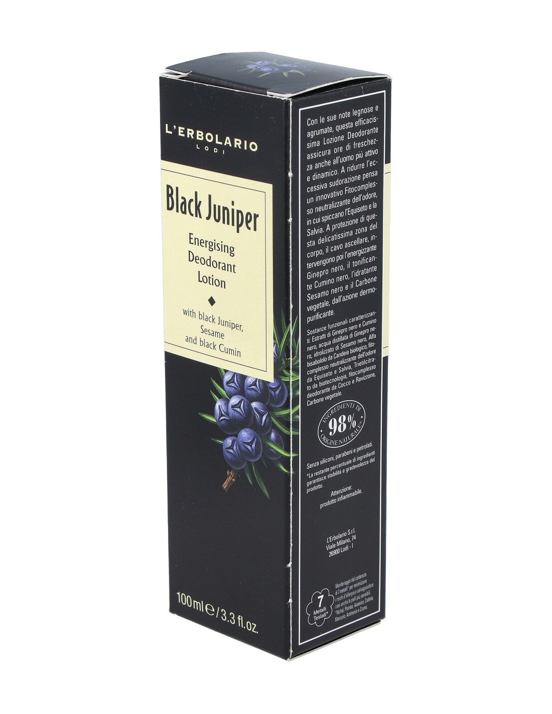 INCI: Alcohol denat., Aqua (Water), Juniperus communis fruit water, Triethyl citrate, Parfum (Fragrance), Juniperus communis fruit extract, Nigella sativa seed extract, Hydrolyzed sesame extract, Equisetum arvense extract, Salvia officinalis (Sage) oil , Bisabolol, Charcoal powder, Polyglyceryl-10 laurate, Glycerin, Citronellyl methylcrotonate, Glyceryl caprylate, Citric acid, Benzyl benzoate, Citronellol, Hexyl cinnamal, Hydroxycitronellal, Limonene, Linalool, Potassium sorbate, Sodium benzoate.