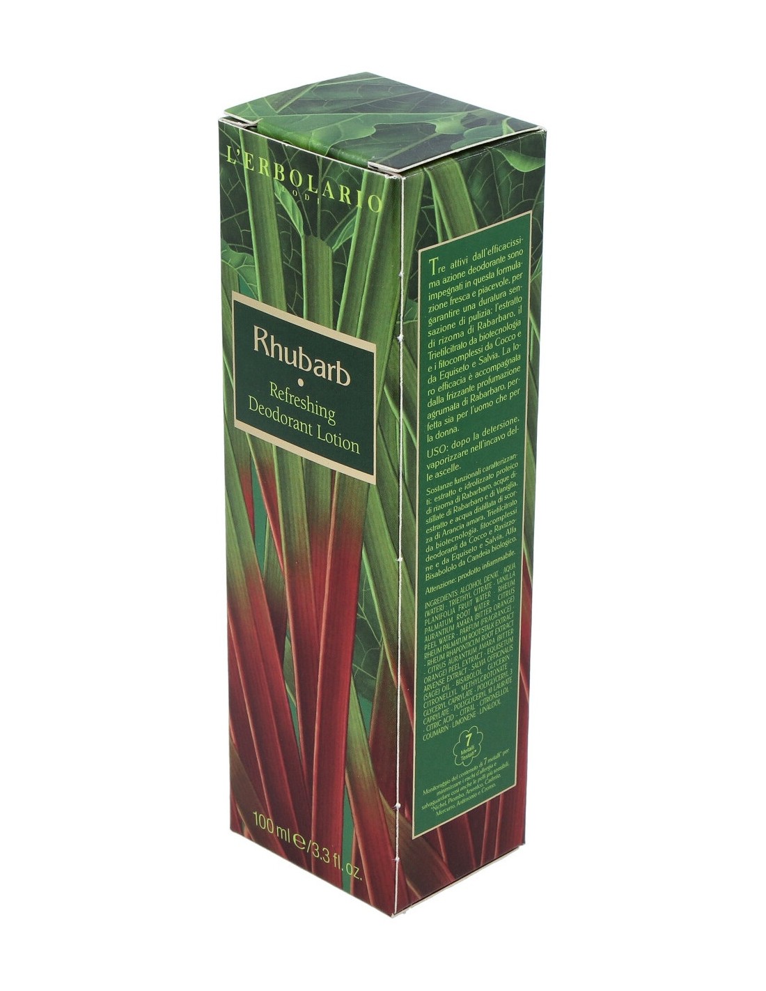 INCI: Alcohol denat., Aqua (Water), Triethyl citrate, Citrus aurantium amara (Bitter orange) peel water, Rheum palmatum root water, Vanilla planifolia fruit water, Parfum (Fragrance), Rheum palmatum root/stalk extract, Rheum rhaponticum root extract, Citrus aurantium amara (Bitter orange) peel extract, Equisetum arvense extract, Salvia officinalis (Sage) oil , Bisabolol, Glycerin, Citronellyl methylcrotonate, Glyceryl caprylate, Polyglyceryl-3 caprylate, Polyglyceryl-10 laurate, Citric acid, Citral, Citronellol, Coumarin, Limonene, Linalool, Potassium sorbate, Sodium benzoate.