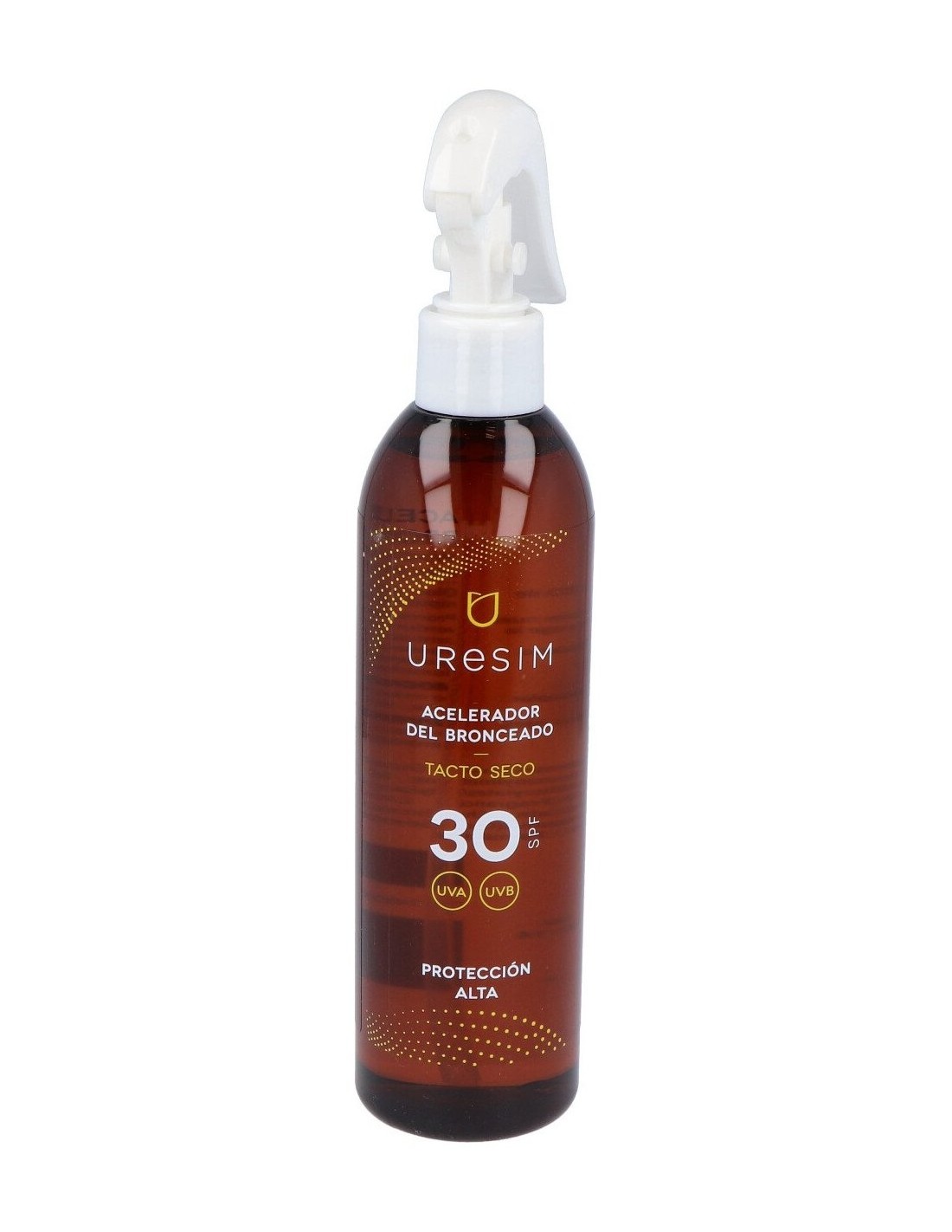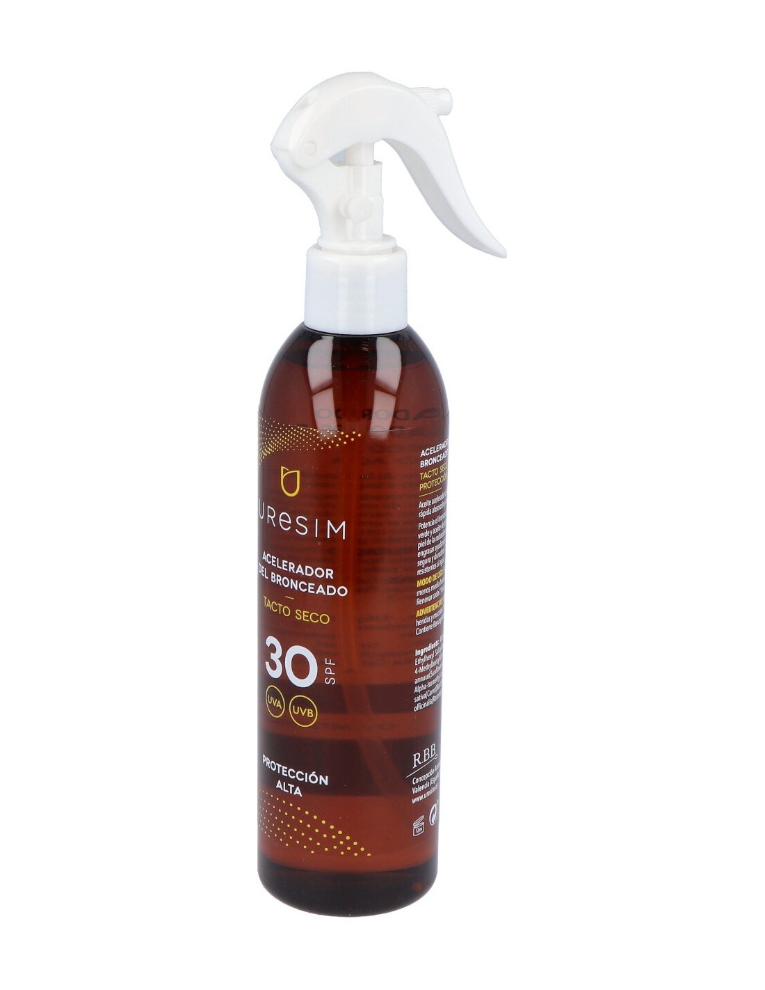 Solución oleosa de rápida absorción y tacto seco (sin residuos). Favorece el bronceado rápido de la piel a la vez que la protege ya que posee un SPF 30. El resultado se obtiene gracias a su contenido en aceite de zanahoria, rico en carotenos y vitamina A. Favorece la síntesis de melanina y la renovación celular. También favorece el resultado el aceite de nuez verde, que minimiza la inflamación producida por la radiación solar y contribuye al bronceado. Para todo tipo de pieles.URESIM acelerador bronceado 300ml. de URESIM