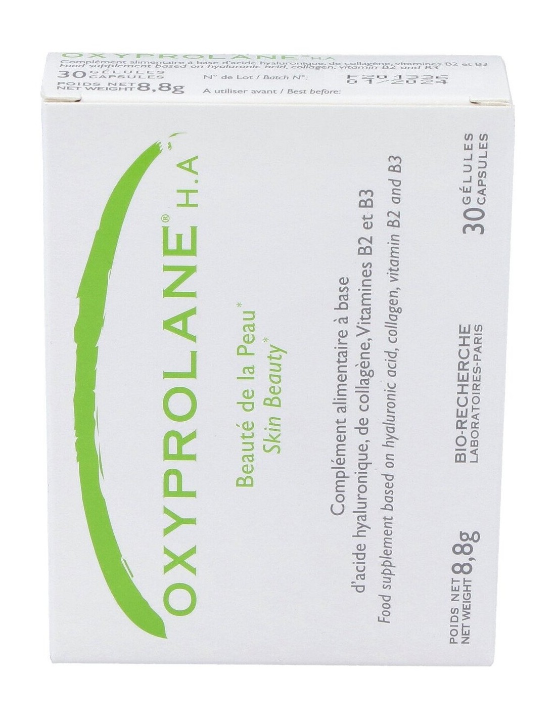 Hidrolisado de colágeno de pescado, cápsula contenedora: hidroxipropilmetil celulosa, maltodextrina, ácido hialuránico, niacinamida (Vitamina B3), anti-aglomerantes: sal de magnesio de ácidos grasos, dióxido de silicio, riboflavina (Vitamina B2).
