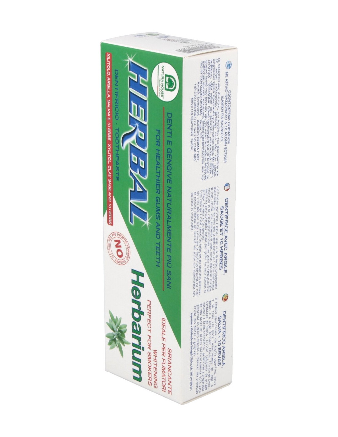 Aqua (water), Hydrated silica, Glycerin, Sorbitol, Xylitol, Cellulose gum, Solum fullonum (Fullers earth), Salvia officinalis (Sage) extract, Potentilla erecta (Tormentil) extract, Tilia cordata (Linden) extract, Krameria triandra (Rathany) extract, Plantago lanceolata (Plantain) extract, Aloe barbadensis (Aloe vera) leaf juice powder, Mentha piperita (Mint) extract, Glycirrizha glabra (Licorice) extract, Aesculus hippocastanum (Horsechestnut) extract, Malva silvestris (Mallow) extract, Mimosa tenuiflora (Mimosa tenuiflora) bark extract, Glycyrrhetinic acid, Sodium fluoride, Zinc citrate, Calcium gluconate, Sodium bicarbonate, Cocamidopropyl betaine, Sodium benzoate, Alcohol, Propylene glycol, Aroma (Flavor), CI 77891 (Titanium dioxide), C.I. 75810 (Chlorophyllin copper complex).