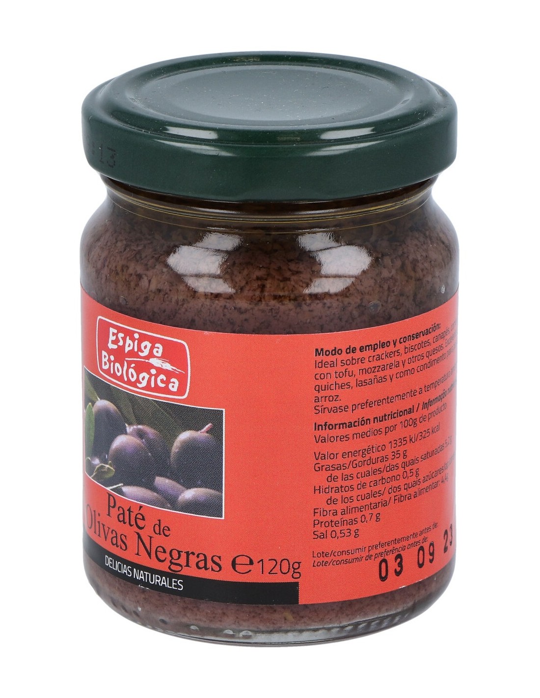 Paté 100% vegetal y ecológico de sabor aromático potenciado por el aceite de oliva virgen extra. Sin gluten. Producto vegano.PATE DE OLIVAS NEGRAS 120gr. ECO SG VEGAN de ESPIGA BIOLOGICA