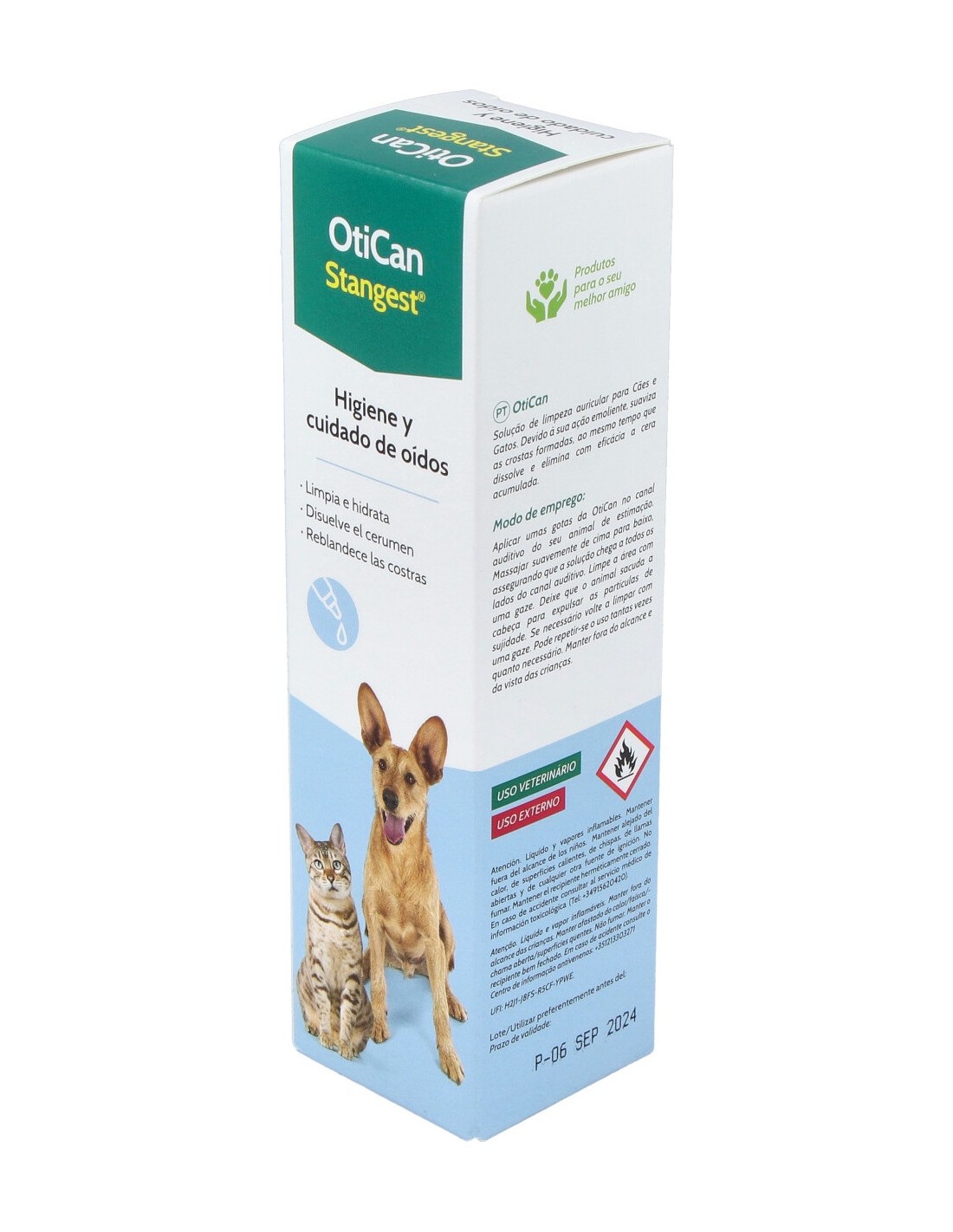 Verter gotas con abundancia en el conducto auditivo. Masajear por presión con los dedos la base del oído externo durante unos minutos. Inclinar la cabeza del perro para extraer fácilmente el cerumen disuelto.