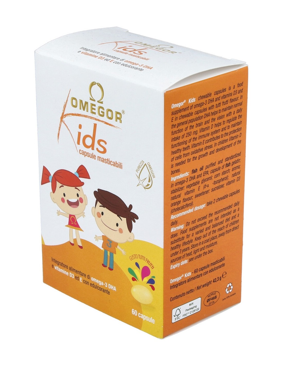 Aceite de pescado formulado en cápsulas masticables que están diseñadas para saber como una gomita, al tiempo que proporcionan cantidades adecuadas de EPA y DHA por porción. También contiene vitamina E y vitamina D para el desarrollo de huesos y dientes. Sabor a tutti frutti.