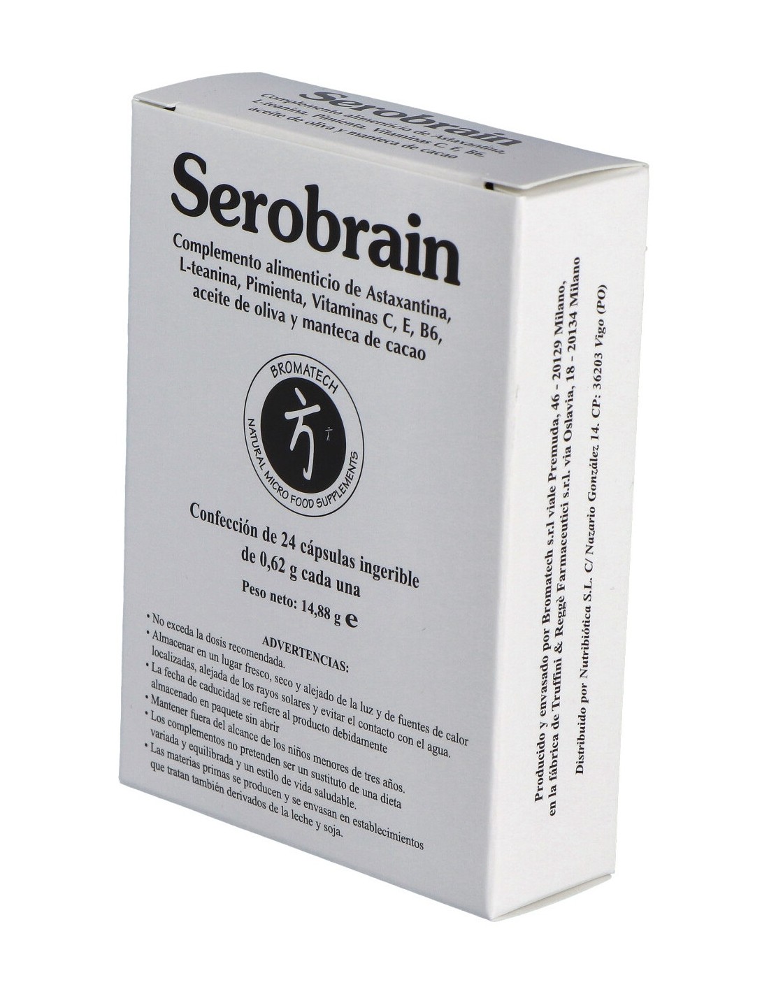 Manteca de cacao, aceite extra virgen de oliva, gelatina (cápsula), vitamina C, ext. seco de cúrcuma, l-tenina, agente antiaglomerante, bióxido de silicio, antioxidante: DL alfa tocoferol, vitamina E, haematecoccus pluvialis flotow, aceite de thallus, titulado en astaxantina, agente de revestimiento: idrosopropilmetilcelulosa, vitamina B6 (piridoxina idrocloruro), estabilizante: glicerol, colorante: óxido de hierro, ext. seco titulado de pimienta negra.