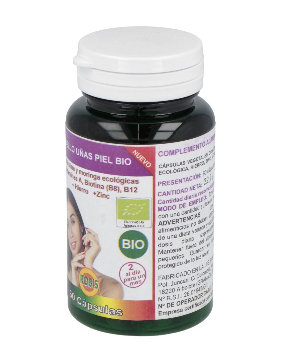 Mejora el aspecto de la piel, disminuye la caída de cabello, fortalece la uñas y mantiene la elasticidad de la piel.CABELLO PIEL Y UÑAS 60cap. BIO de ROBIS