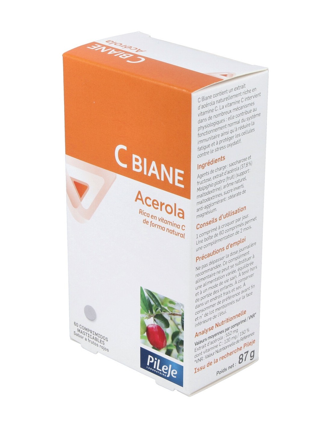 Complemento alimenticio rico en vitamina C de origen natural (acerola). Sabor a frutos rojos.