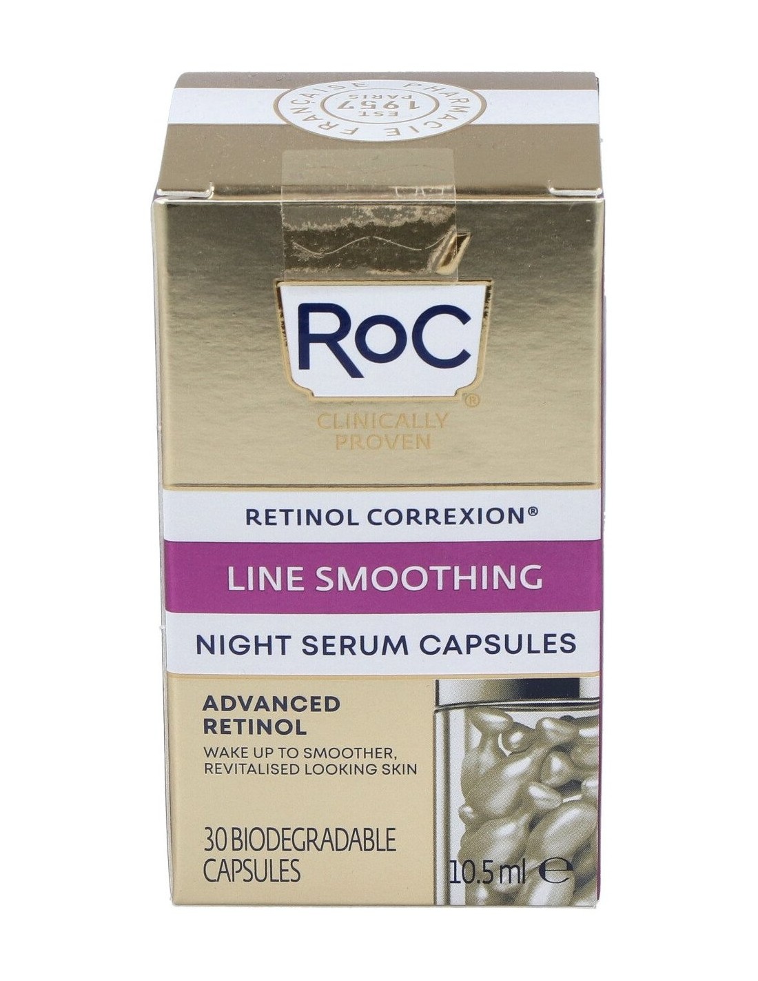 Este Sérum en cápsulas de noche suaviza y mejora visiblemente la apariencia de piel sin colágeno, para proporcionar un acabado sedoso y renovado, gracias una alta concentración de Retinol puro.