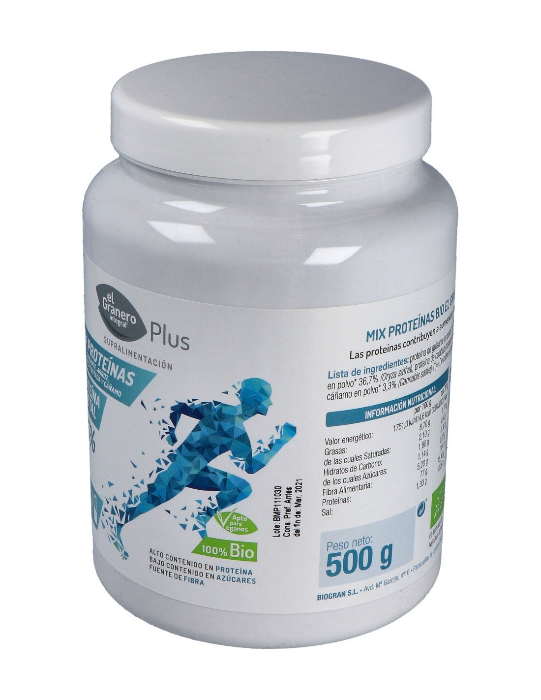 Proteína de guisante* 53,3%, (Pisum sativum L.), proteína de arroz en polvo* 36,7% (Oryza sativa), proteína de calabaza tostada en polvo* 6,7% (Curcubita pepo) y proteína de cáñamo en polvo* 3,3% (Cannabis sativa).