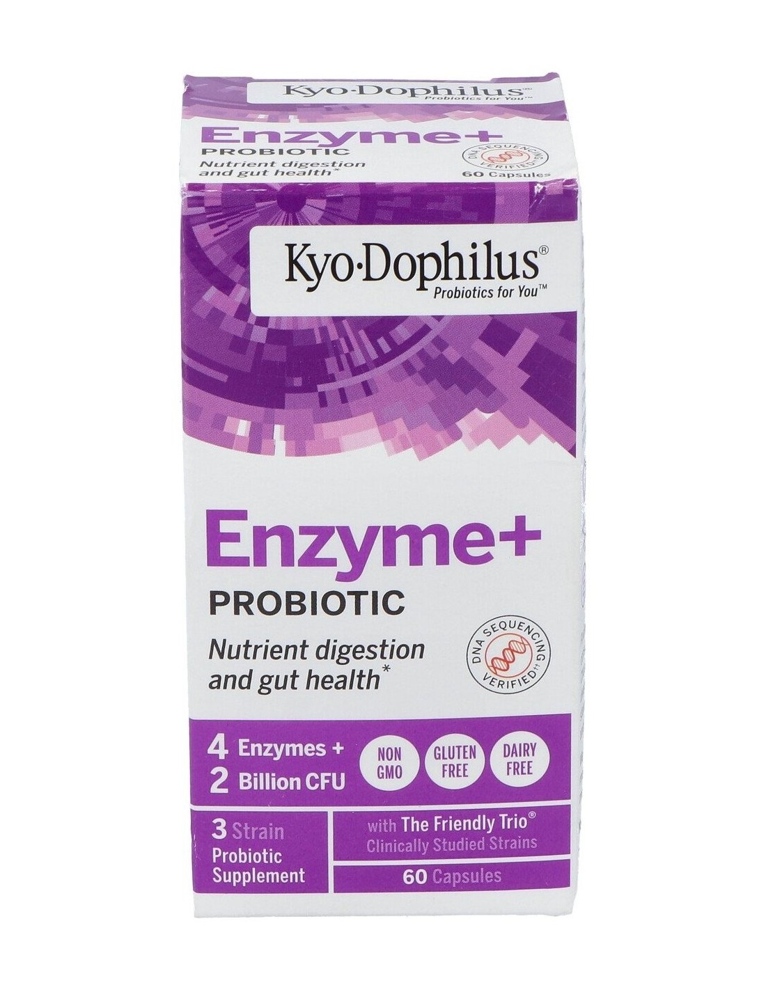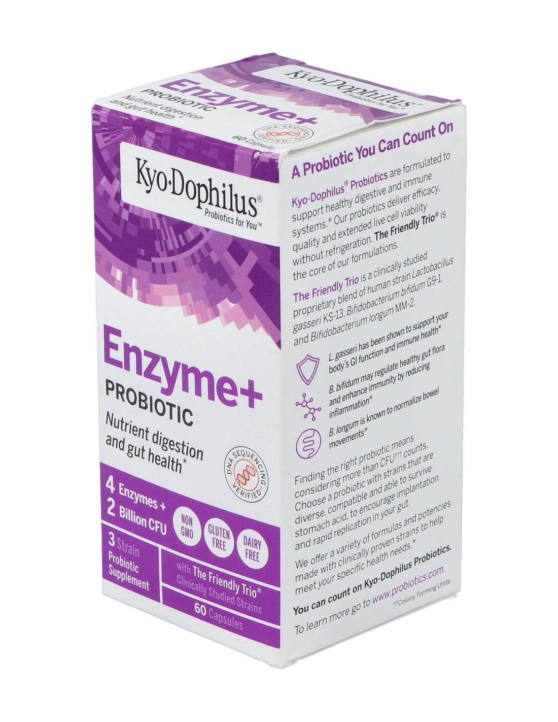 L-Acidophilus KS-13 .. 1000 millones de células vivas, complejo de enzimas... 155 mg. Otros: gelatina, almidón de maíz, dextrina, carbonato cálcico, silica y estearato de magnesio.