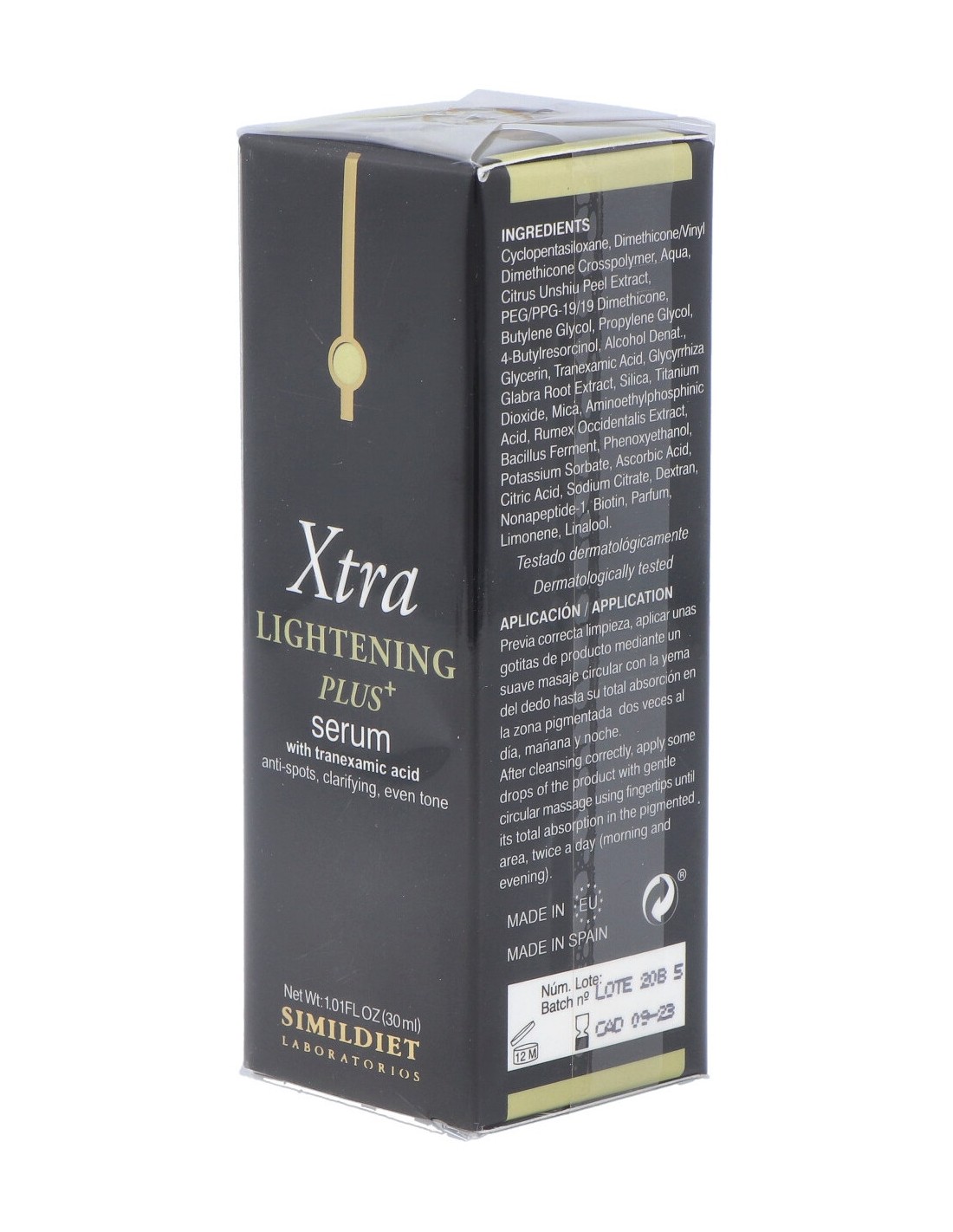 Rumex occidentalis extract, nonapeptide-1, aminoethylphosphinic acid, 4-butylresorcinol, glycerrhiza glabra root extract, bacillus ferment, citrus unshiu, vitamina C.