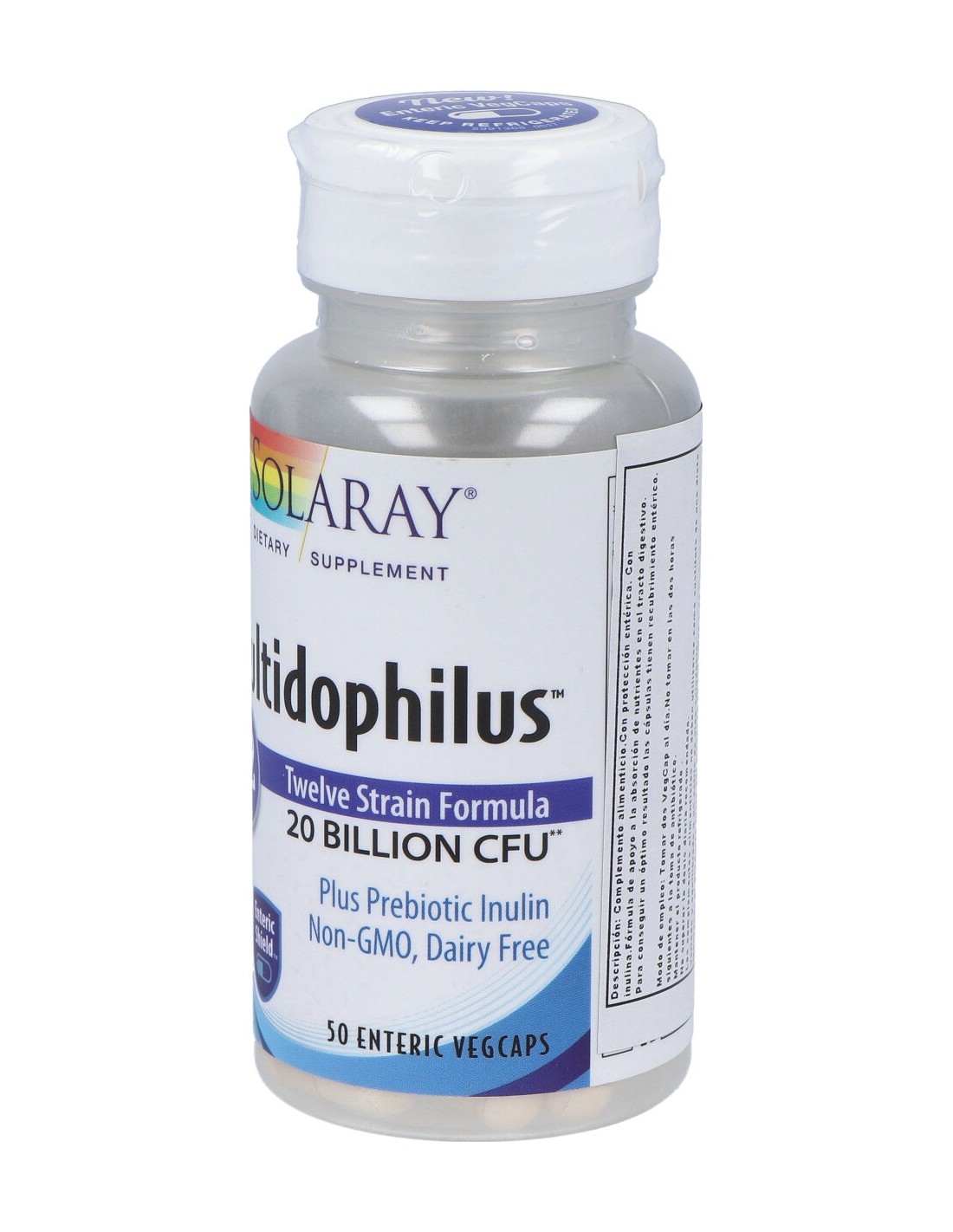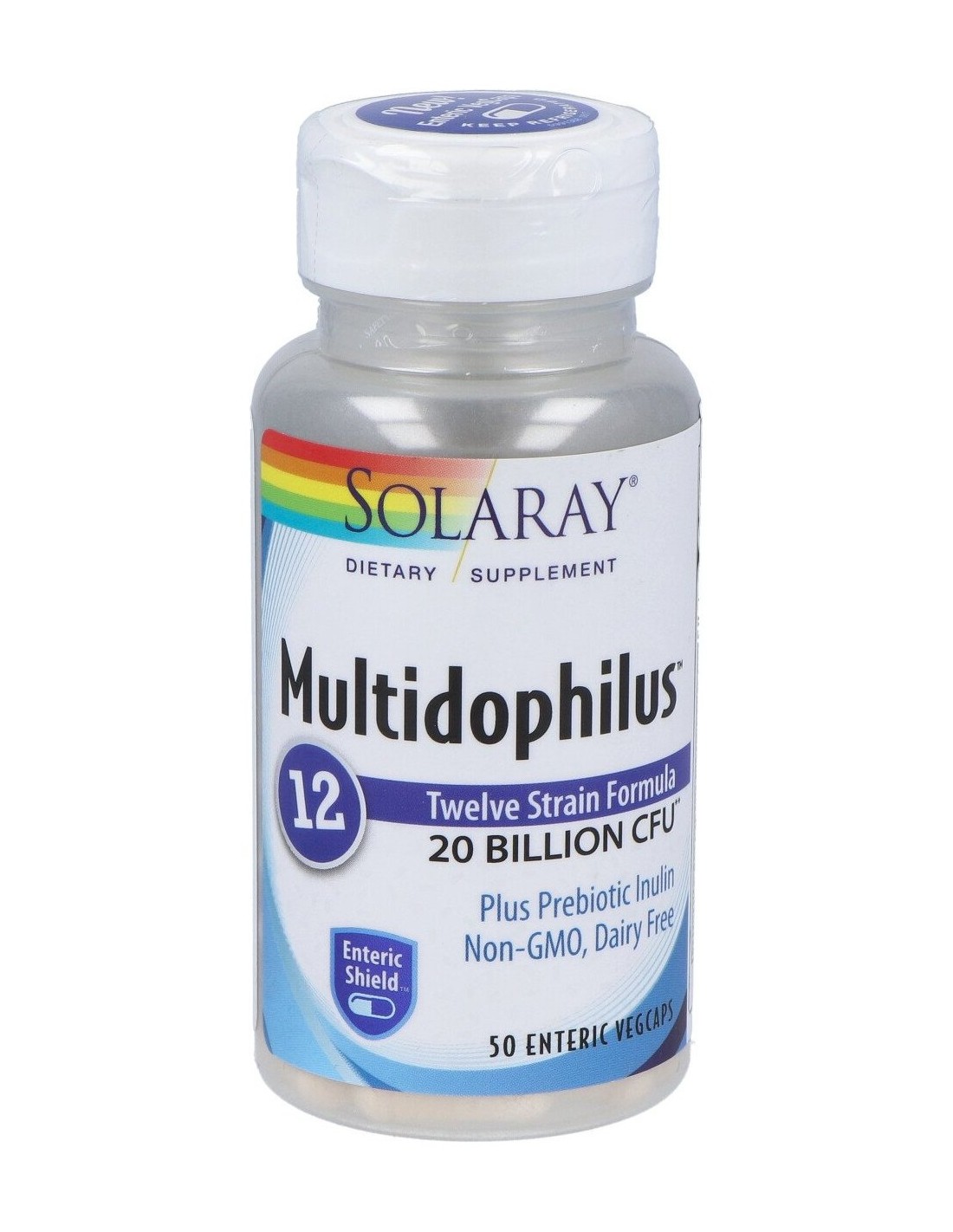 Probiótico que contiene 12 cepas distintas en cápsulas con protección entérica y 20 mil millones de unidades formadoras de colonias por toma. Apto para veganos.