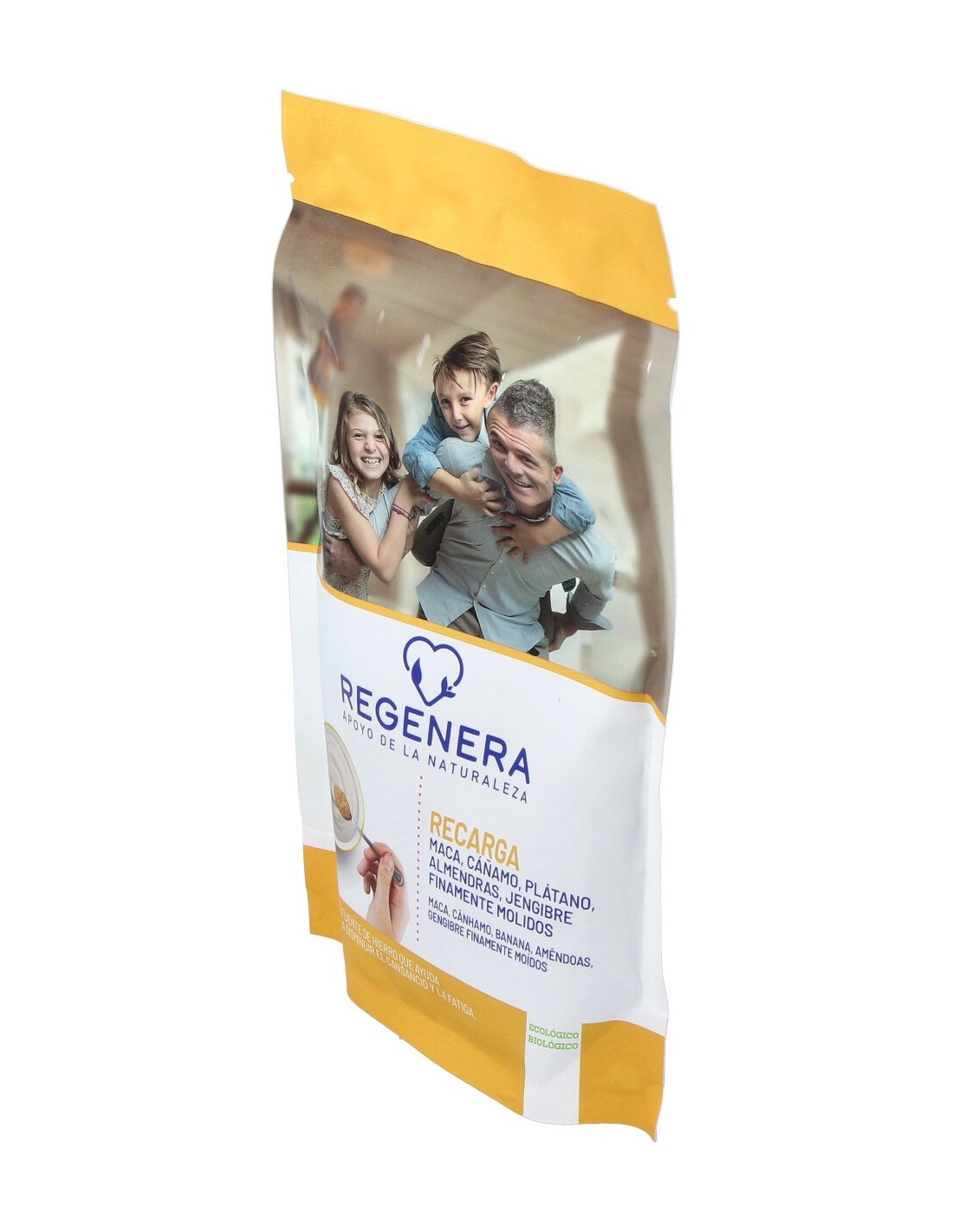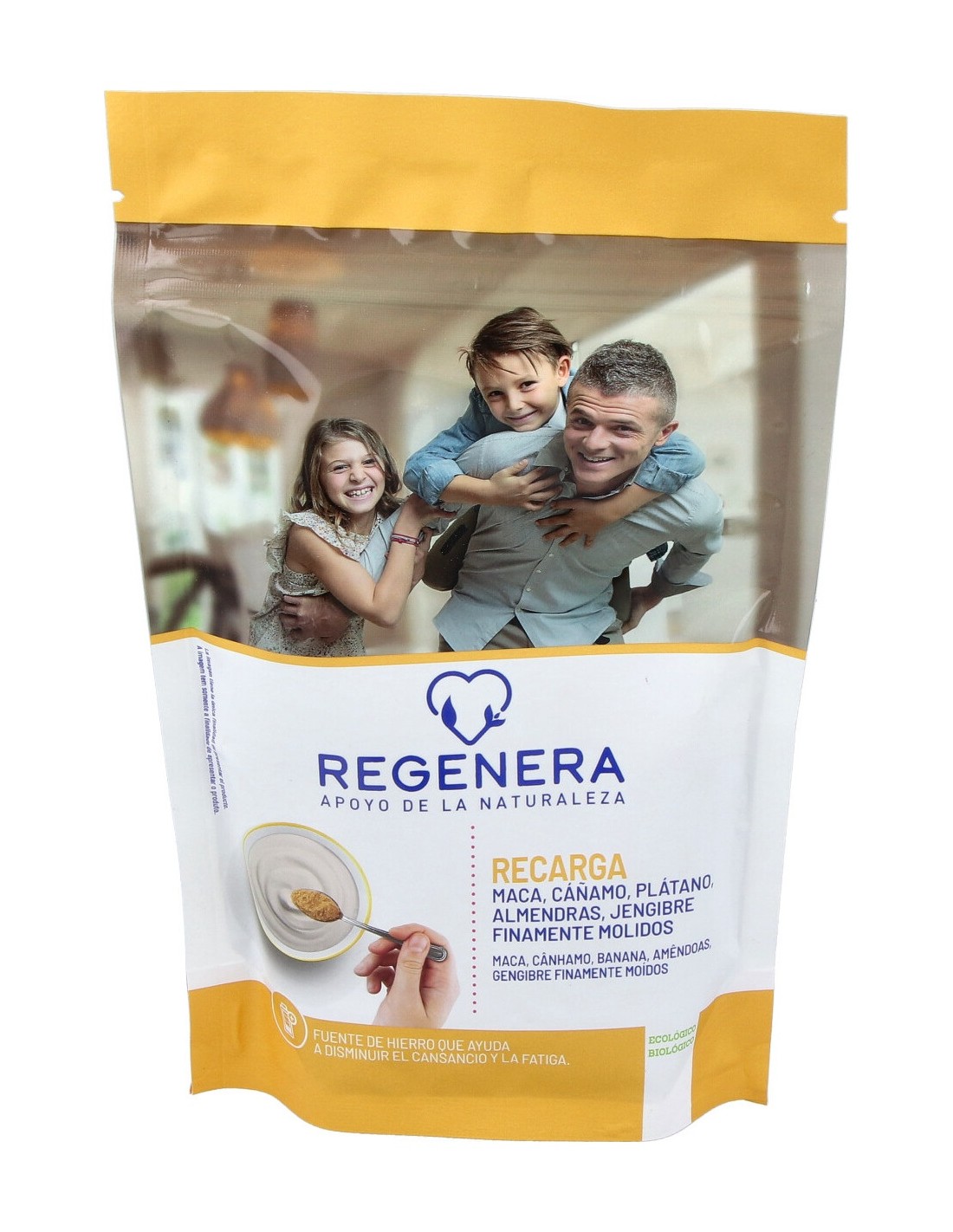 30% cáñamo en polvo, 30% raíz de maca, 20% banana en polvo, 15% harina de almendras, 5% jengibre.