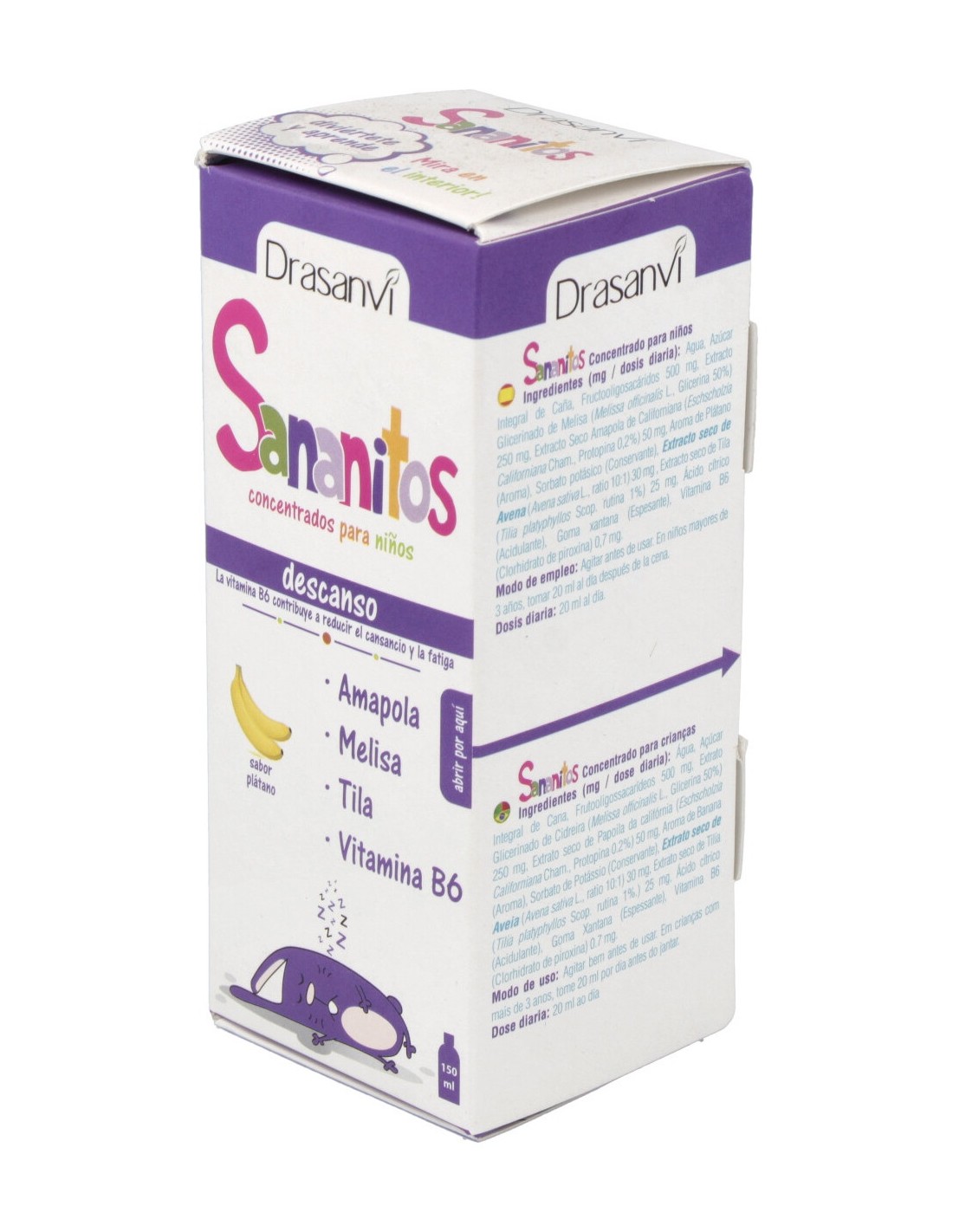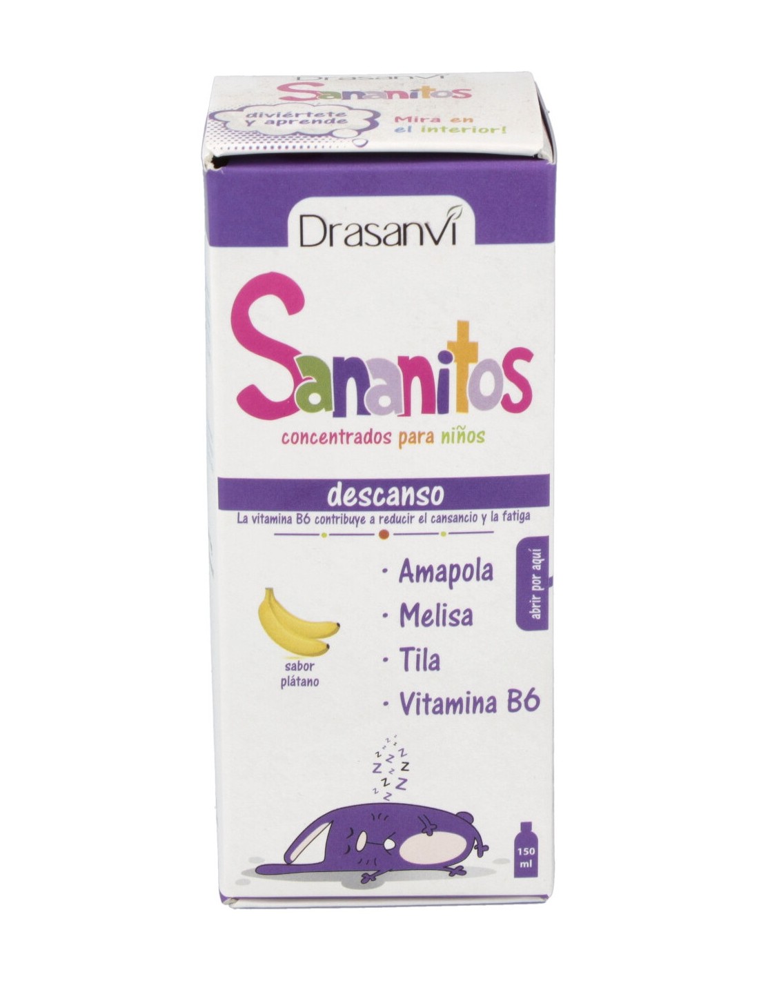 Producto a base de Extractos Vegetales estandarizados de Melisa, Amapola de California, Avena y Tila. Gracias a su contenido en Vitamina B6 contribuye al funcionamiento normal del sistema nervioso y a disminuir el cansancio y la fatiga. Gracias a su aporte en Melisa contribuye una ayuda para mantener un sueño normal y saludable. Gracias su aporte en Amapola contribuye a la relajación óptima, mejorando la calidad del sueño natural.SANANITOS descanso 150ml. de DRASANVI