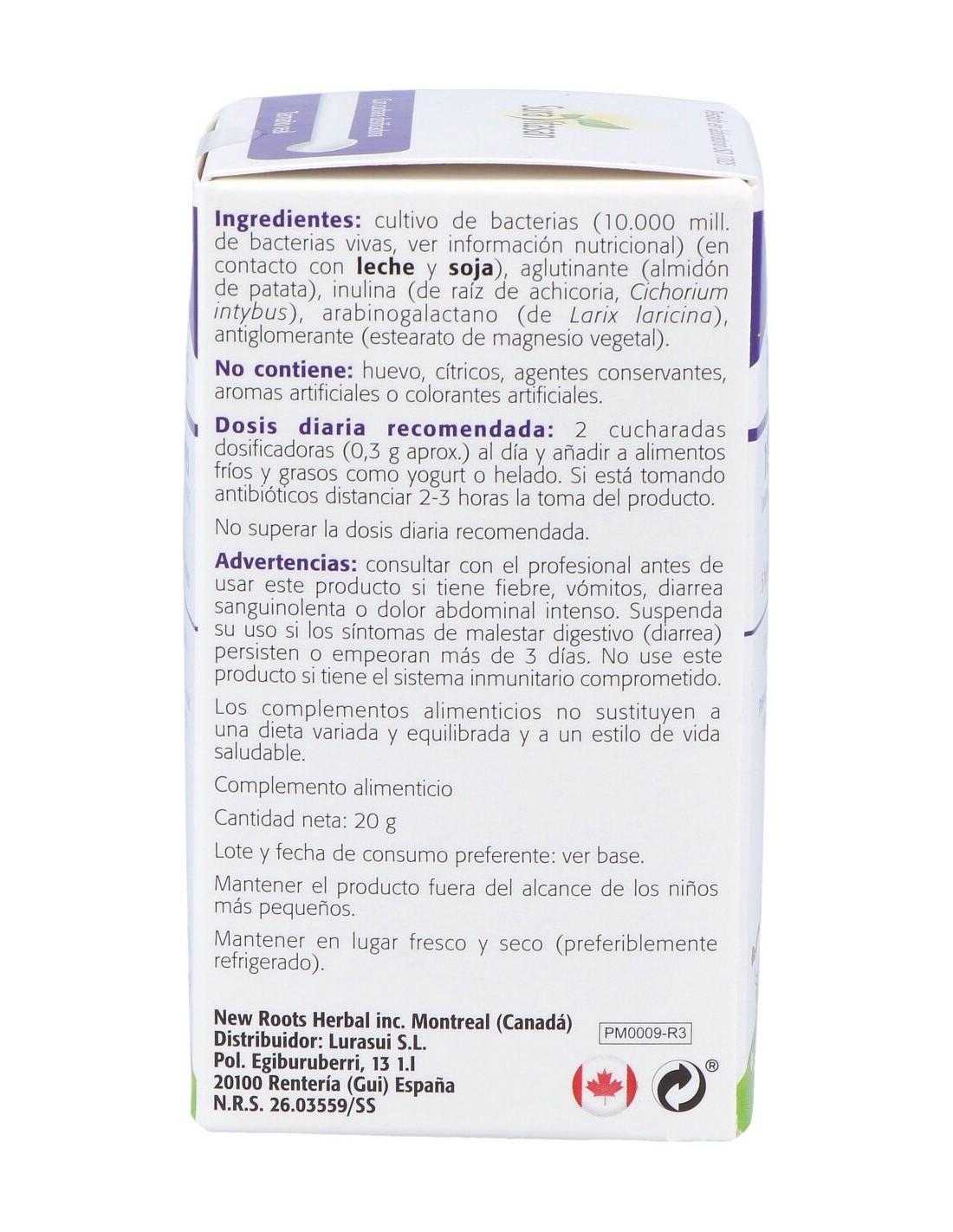 Cultivo de bacterias (10.000 mill. de bacterias vivas, ver información nutricional), inulina (de raíz de achicoria, Cichorium intybus), arabino-oligosacáridos de Larix occidentalis almidón de patata, estearato de magnesio vegetal (antiglomerante), ácido ascórbico (antioxidante), maltodextrina.
