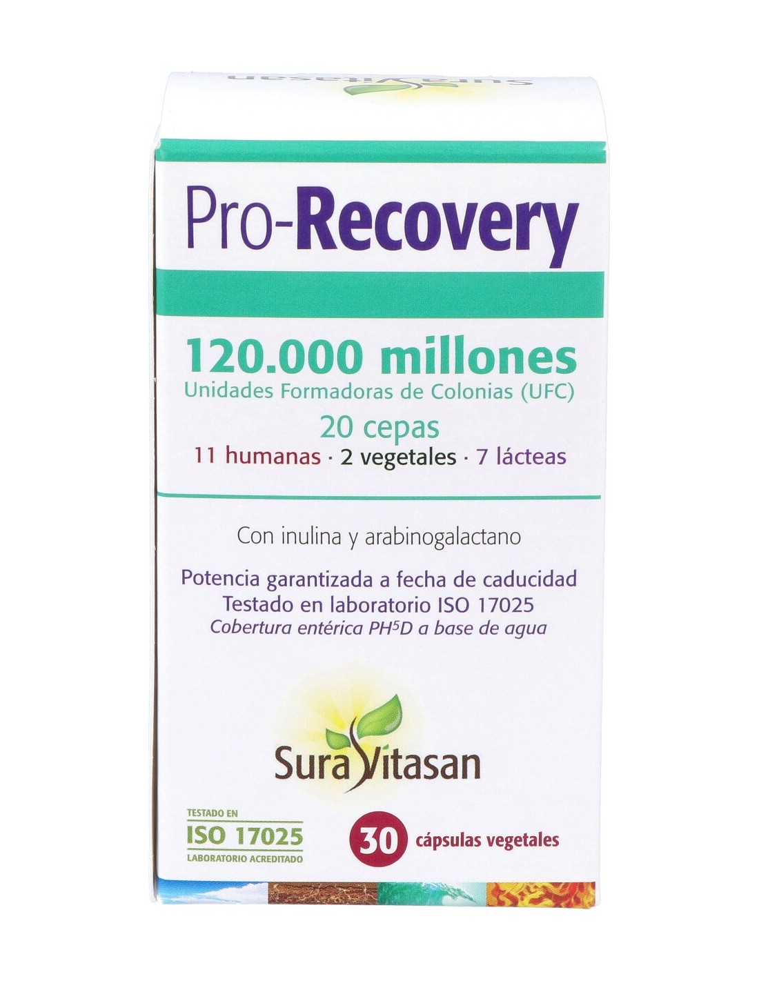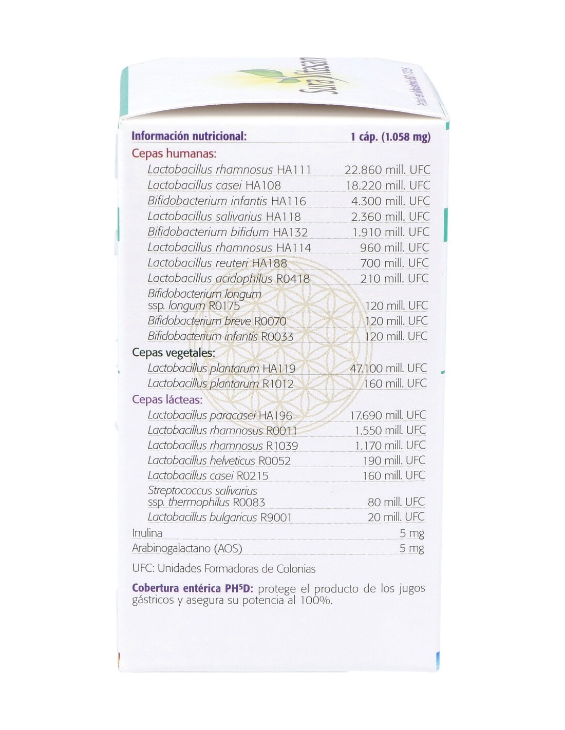 Cultivo de bacterias (120.000 mill. de microorganismos viables por cápsula) (en contacto con leche y soja), inulina (de raíz de achicoria, Cichorium intybus), arabinogalactano (de Larix occidentalis), antiaglomerantes (dióxido de silicio y estearato de magnesio vegetal), almidón de patata, antioxidante (ácido L ascórbico), cápsula vegetal entérica PH5D (agente de recubrimiento: hidroxipropilmetilcelulosa: solución acuosa para la protección entérica: agua purificada).