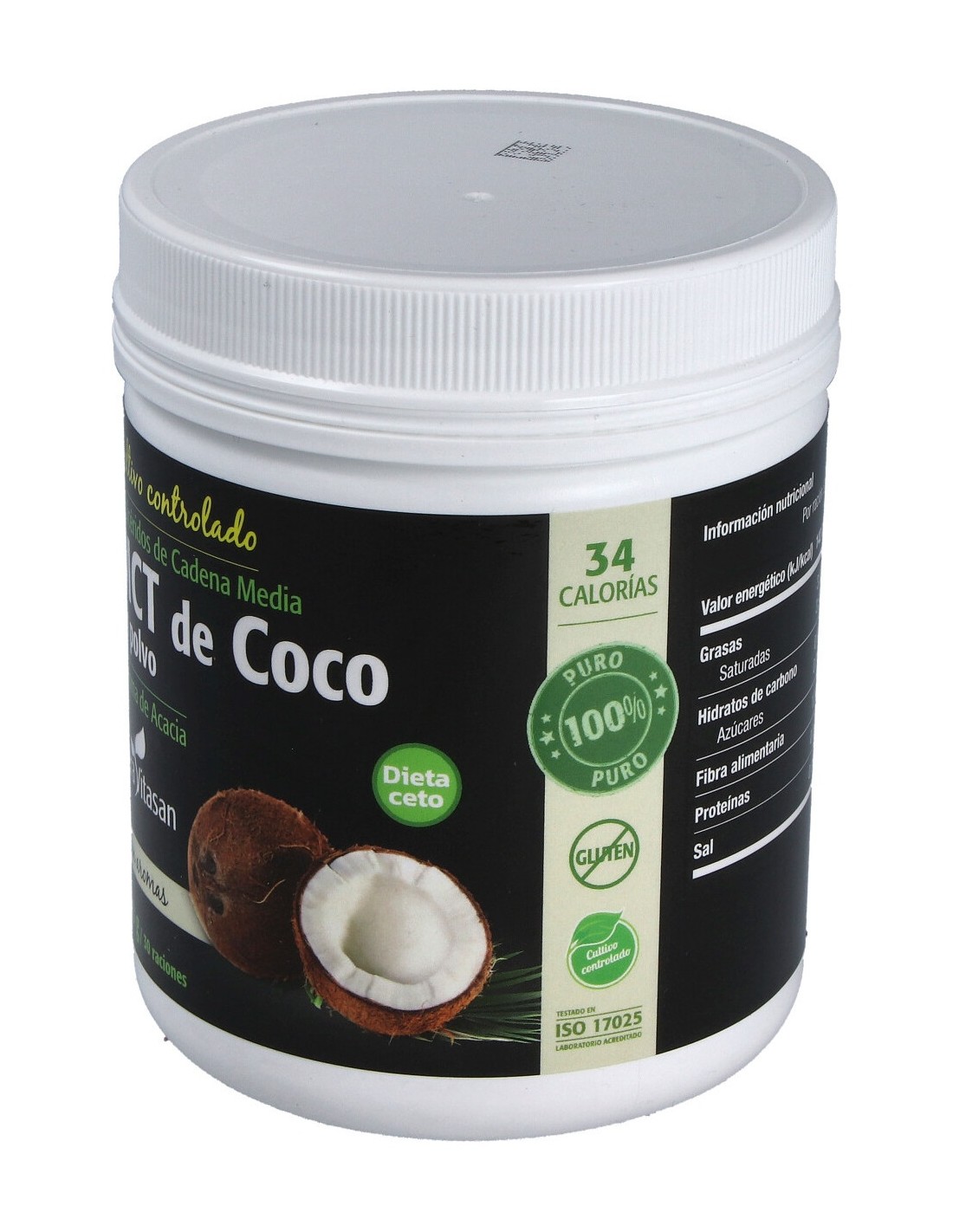 Aceite de coco (Cocos nucifera) MCT en polvo y goma de acacia (Acacia senegal).